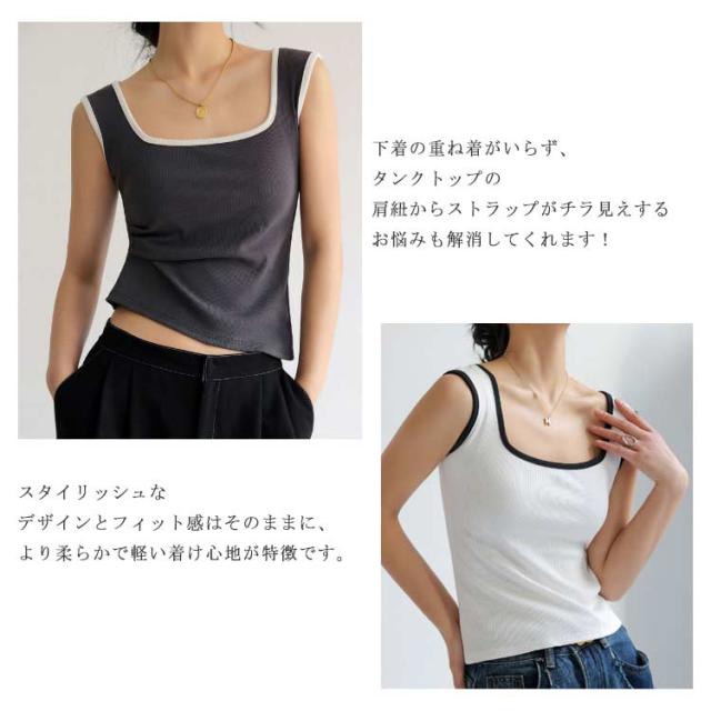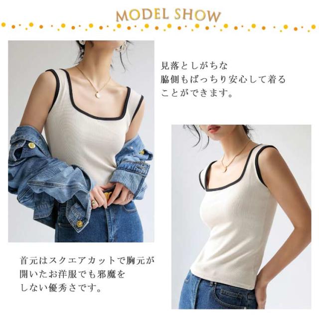 | 肩紐部分が下着の紐をすっぽり覆えるように太くつくられたインナーウェア。 首元はスクエアカットで胸元が開いたお洋服でも邪魔をしない優秀さです。 見落としがちな脇側もばっちり安心して着ることができます。 下着の重ね着がいらず、タンクトップの肩紐からストラップがチラ見えするお悩みも解消してくれます! スタイリッシュなデザインとフィット感はそのままに、より柔らかで軽い着け心地が特徴です。 使い方はあなた次第!日中からおうち時間まで幅広く活躍します。 | |
