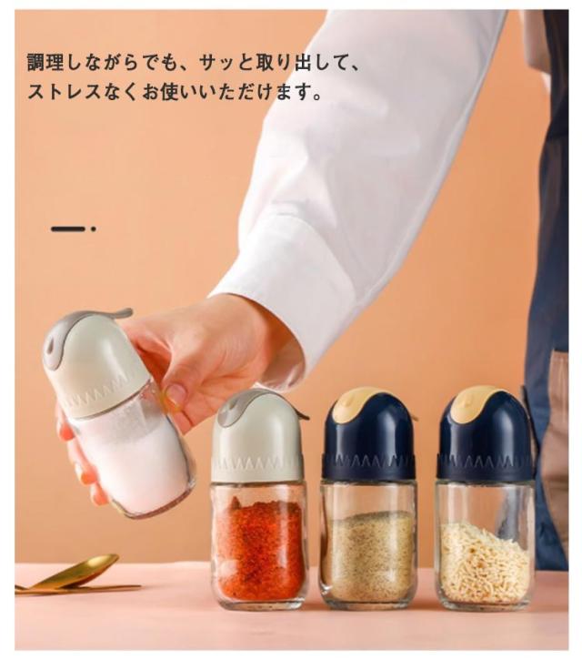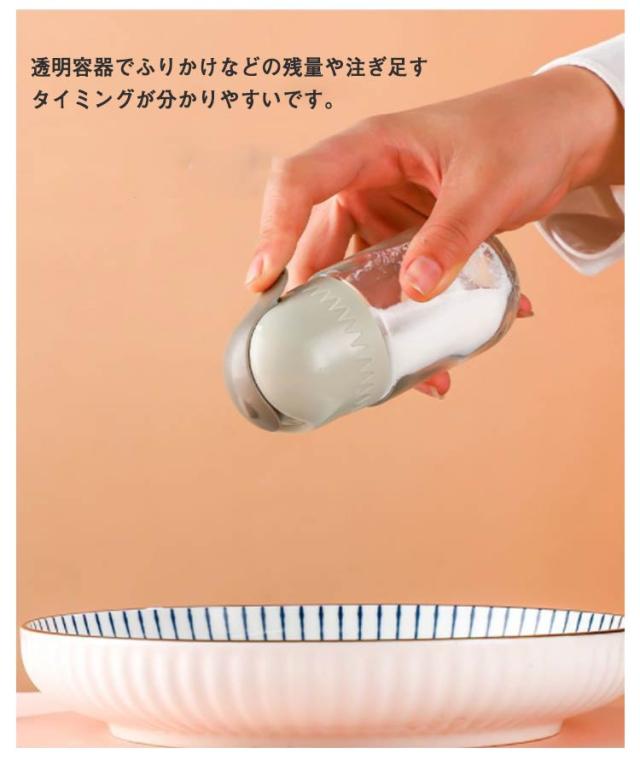 | ワンプッシュオープンで簡単にサッと使えるスパイスボトルです。 調理しながらでも、サッと取り出して、ストレスなくお使いいただけます。 蓋が簡単に外せるタイプだから、詰め替えがラクラク。 透明容器でふりかけなどの残量や注ぎ足すタイミングが分かりやすいです。 塩胡椒・スパイスやハーブを同じボトルで揃えて保存すると見た目もすっきりオシャレ。 | |