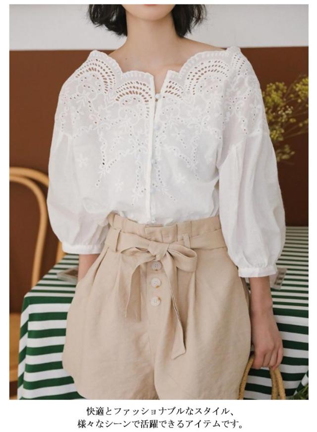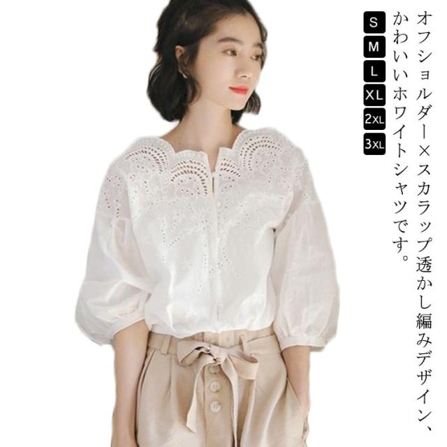 シャツ ブラウスシャツ ブラウス おしゃれ オープンショルダー 七分袖 春夏 春 オフショルダー 大人 きれいめ スカラップ お呼ばれ 透かし編み 夏 ブラウス トップス 白シャツ 20代 30代 レディース S M L XL レディース
