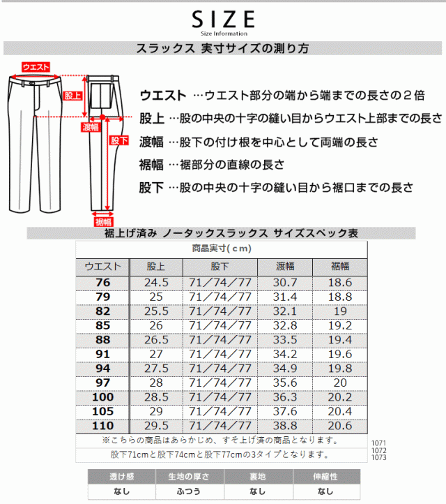 【仕様】ノータック ウォッシャブル 股下71cm/股下74cm/股下77cm