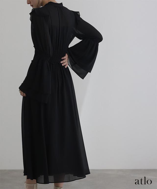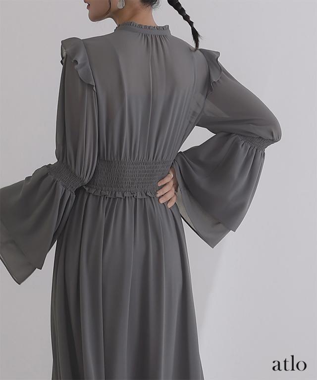 ネックラインとウエストにあるフリルが大人可愛い