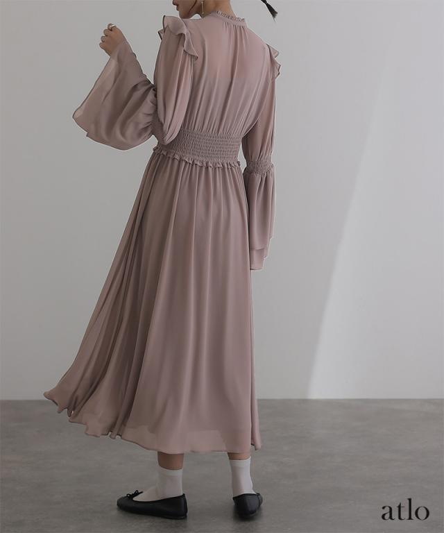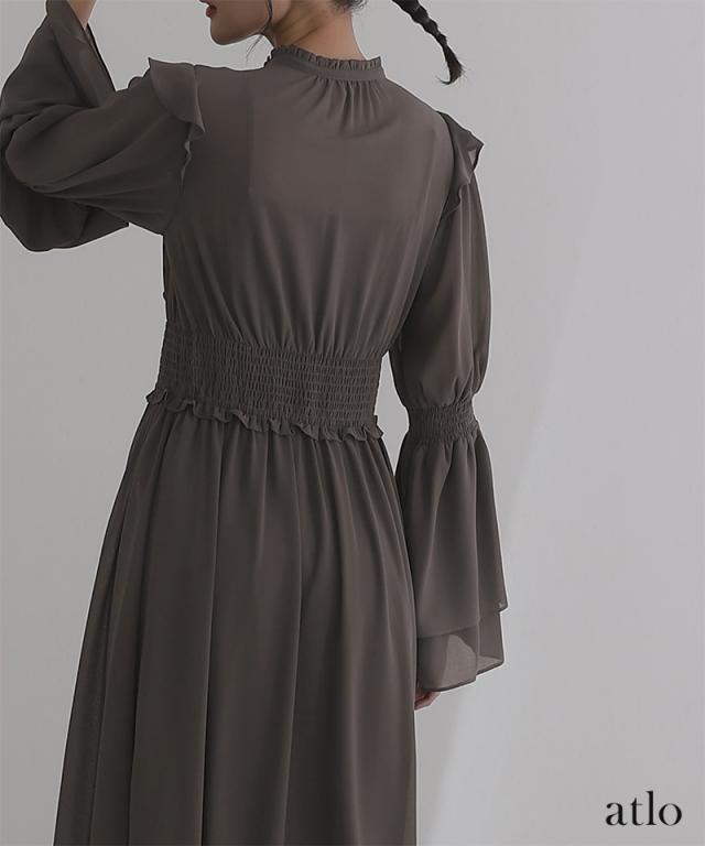 ネックラインとウエストにあるフリルでフェミニンな印象に。