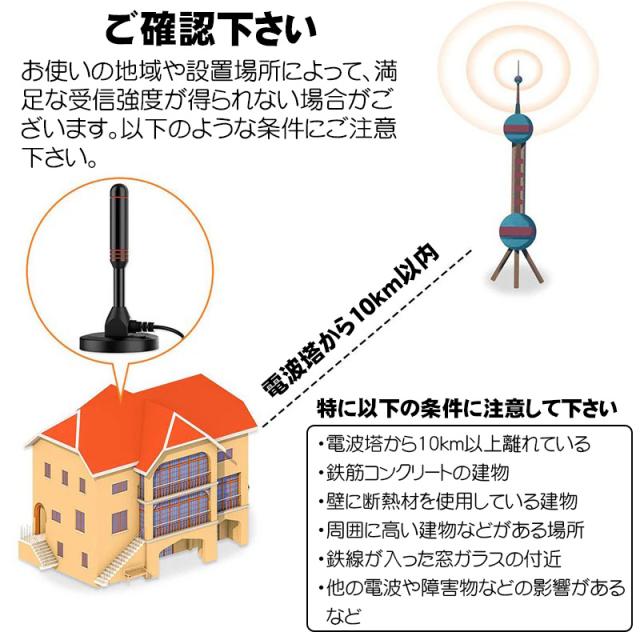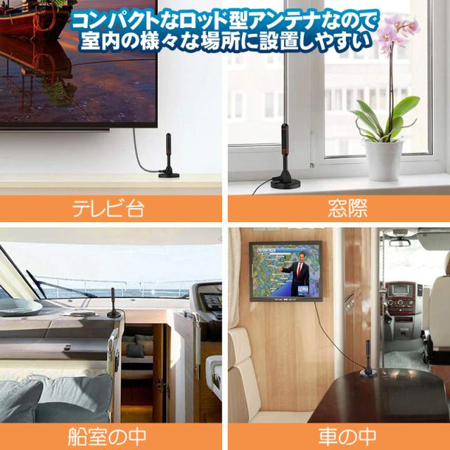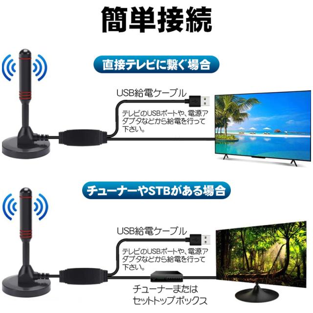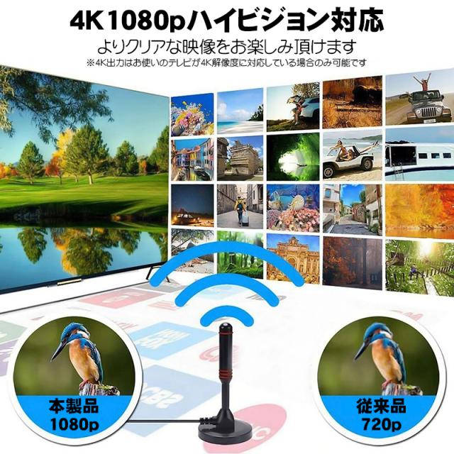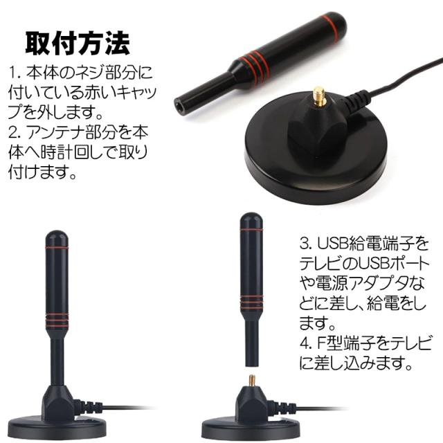 | 受信ブースター(増幅器)が付いているので、受信感度をアップする事ができ、より受信が安定し受信範囲も広くなります。 室内だけでなく、車の中など様々な場所でご利用頂けます。 本体のベーススタンドは磁気吸着式になっているので、車のダッシュボードなどにくっ付けると、より安定して設置できます。 テレビに繋いで室内に設置するだけで簡単に接続可能です。 4K/1080pの映像に対応。よりクリアな映像をお楽しみ頂けます。(4K映像はお使いのテレビが4K解像度に対応している場合のみお楽しみ頂けます。) 【ご使用方法】 1.本体ベーススタンドのネジ部分に付いている赤いキャップを取り外します。 2.アンテナ部分を本体ベーススタンドへ時計回しに取り付けます。 3.USB給電端子をテレビのUSBポートや電源アダプタなどに差し込み、給電が行えるようにします。 4.F型端子をテレビに差し込んで、テレビの電源を入れ、電波の受信強度を確認します。 |