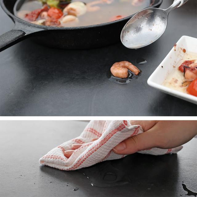 水の吸水率はほぼ0%。油も浸透しにくく、たとえ食品をこぼしてしまってもシミをつくることなく拭き取ることができます。