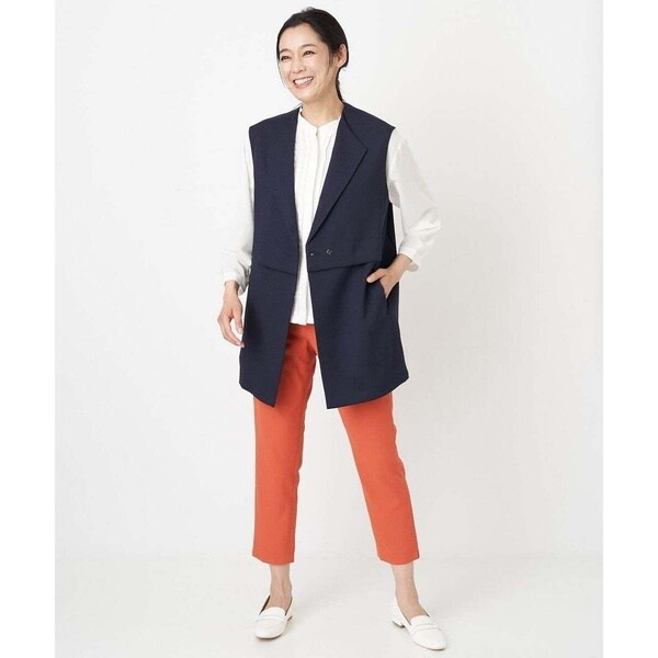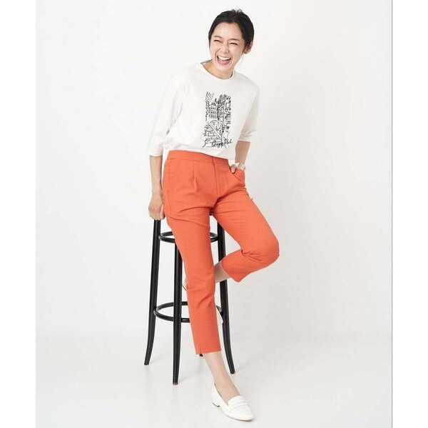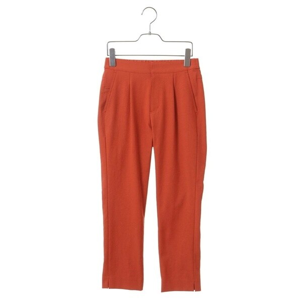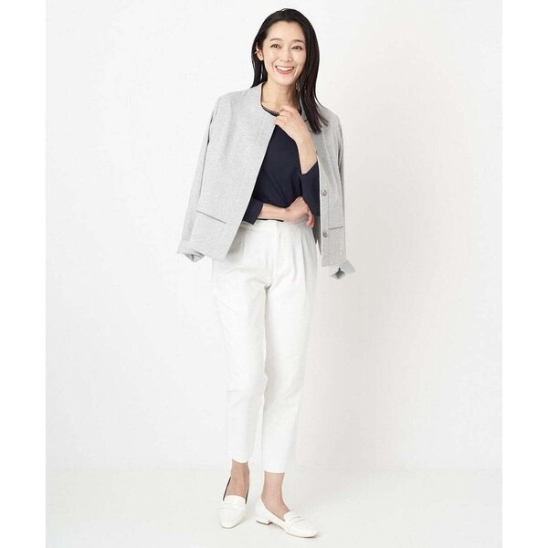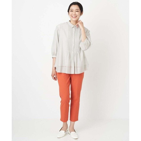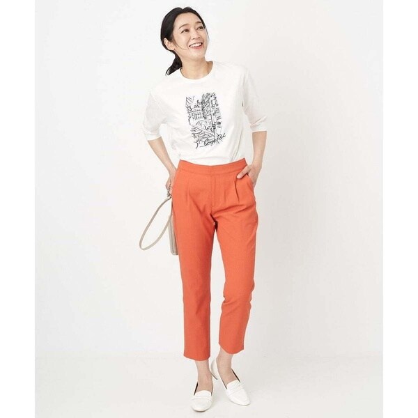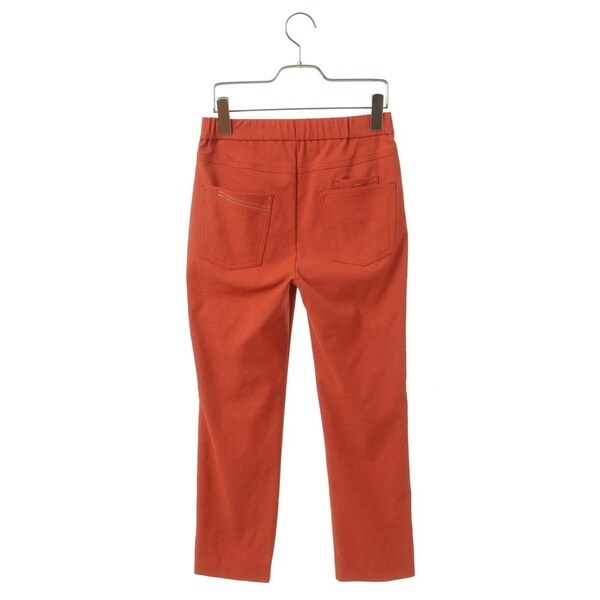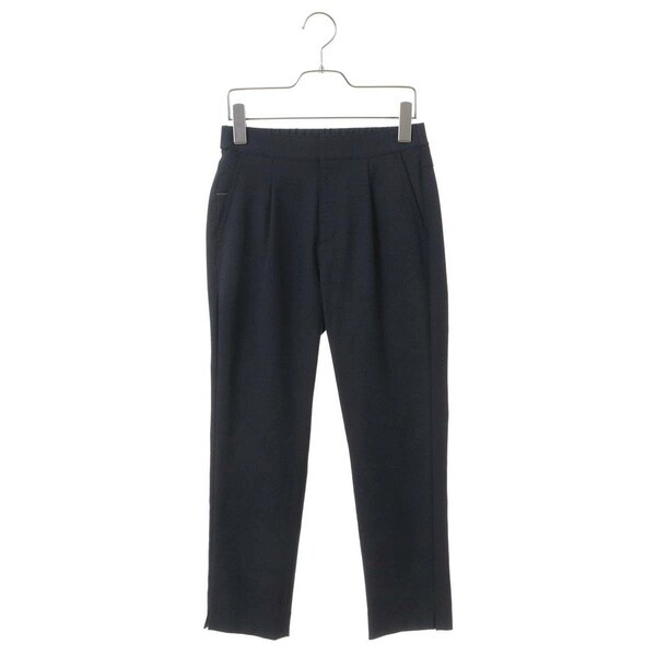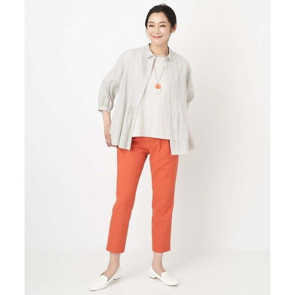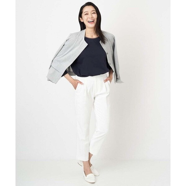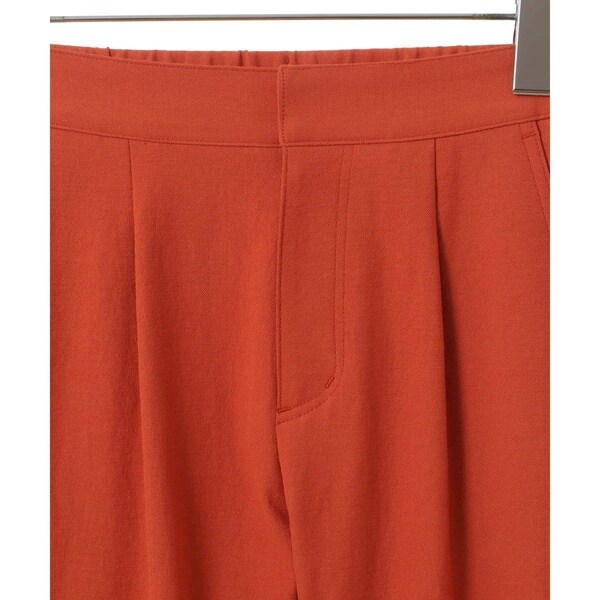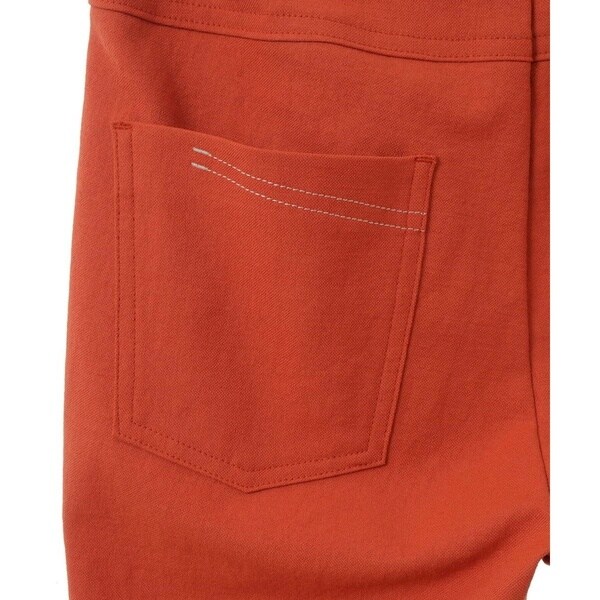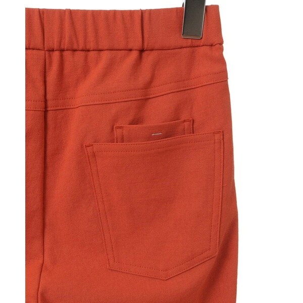1タックでヒップから太ももはほど良いゆとりがあり、膝下はすっきりとしたストレートシルエットでとても綺麗な脚のラインに。後ろウエストはゴムギャザーでストレスフリーな穿き心地。ドライタッチな素材でストレッチが効いているので楽ちんな穿き心地です。さらにシワになりにくい素材なので長時間の座り仕事にもうってつけのパンツです。 部分で配色の閂止めとステッチを使い、デニムのディテールを入れた後ろのアウトポケットデザインでカジュアルスタイルにもすんなりと馴染み、デイリーユースしやすいアイテム。