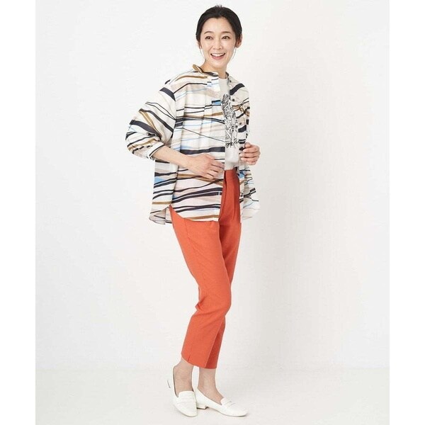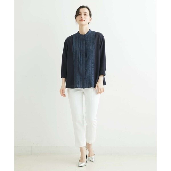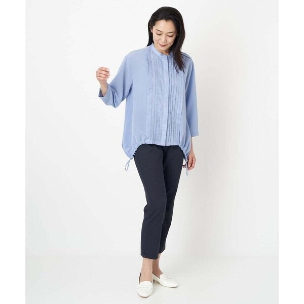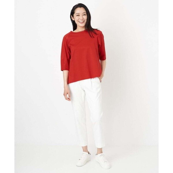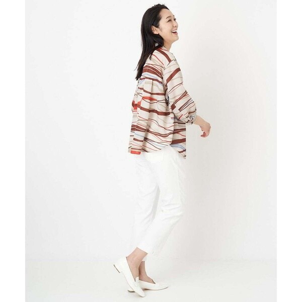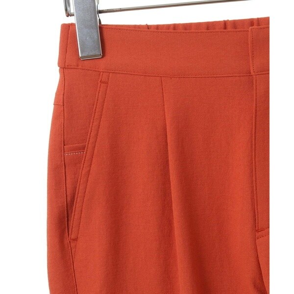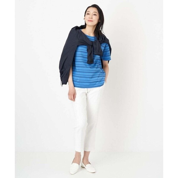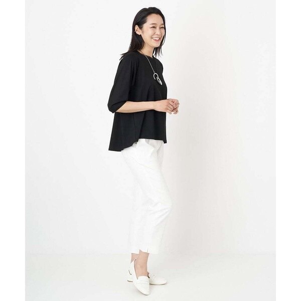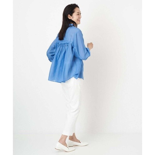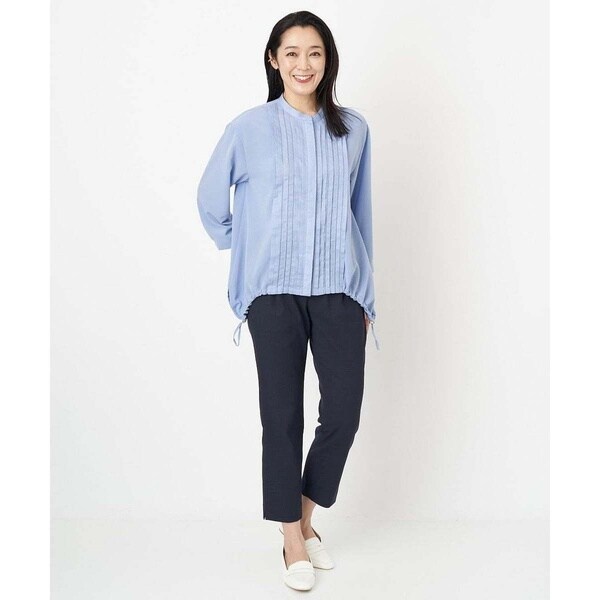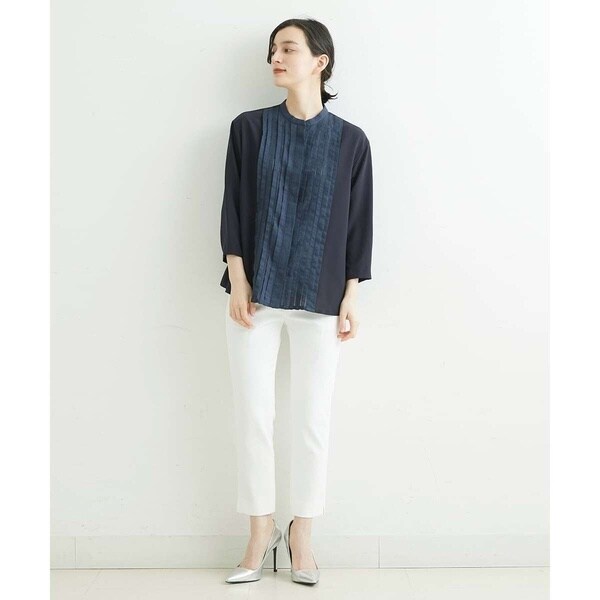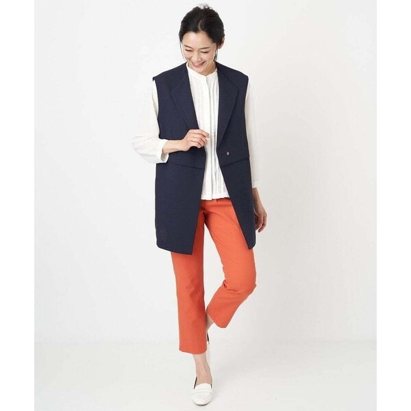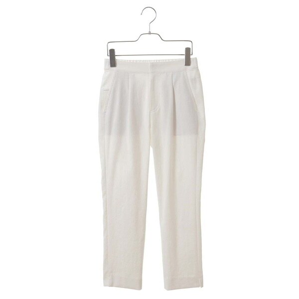 1タックでヒップから太ももはほど良いゆとりがあり、膝下はすっきりとしたストレートシルエットでとても綺麗な脚のラインに。後ろウエストはゴムギャザーでストレスフリーな穿き心地。ドライタッチな素材でストレッチが効いているので楽ちんな穿き心地です。さらにシワになりにくい素材なので長時間の座り仕事にもうってつけのパンツです。 部分で配色の閂止めとステッチを使い、デニムのディテールを入れた後ろのアウトポケットデザインでカジュアルスタイルにもすんなりと馴染み、デイリーユースしやすいアイテム。