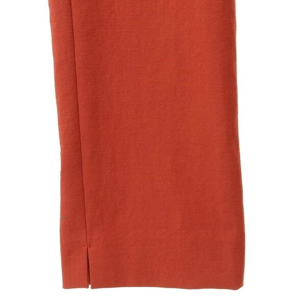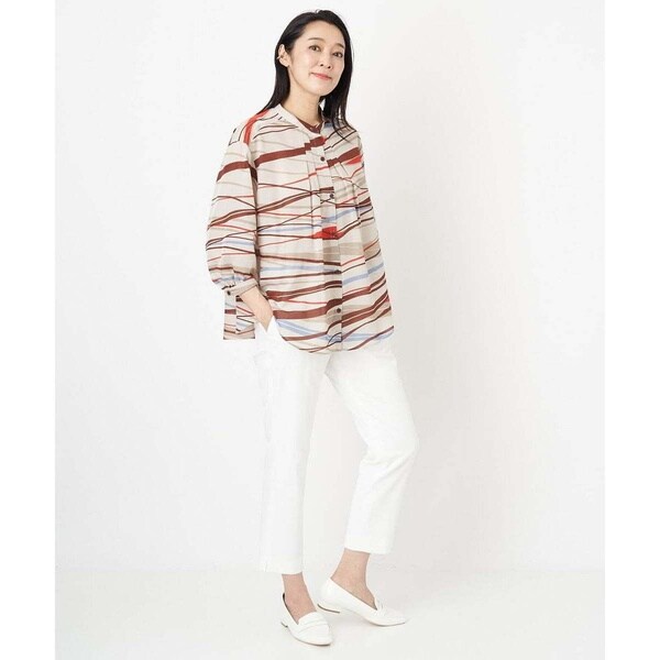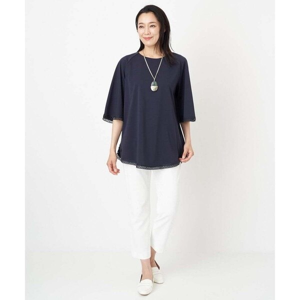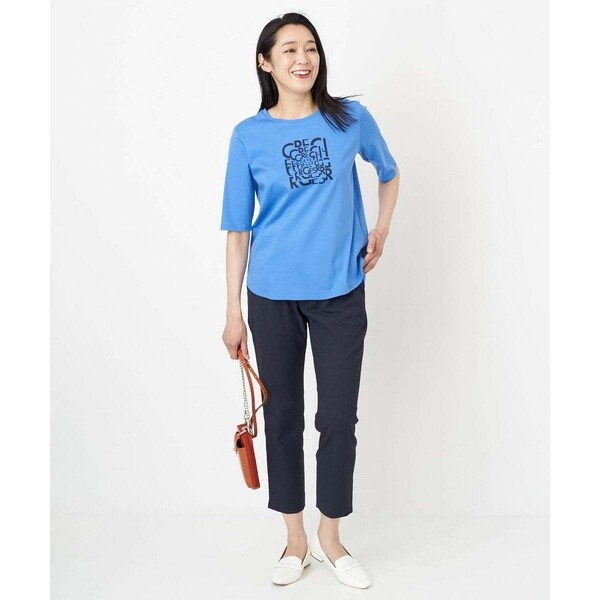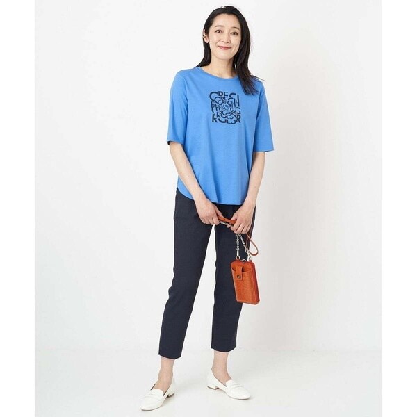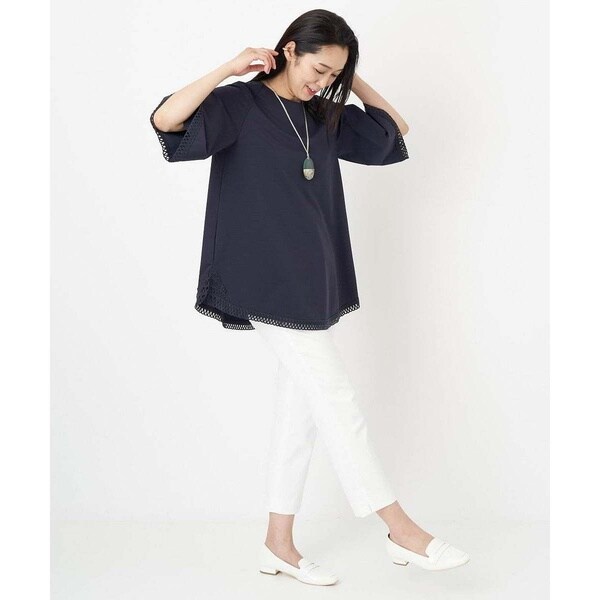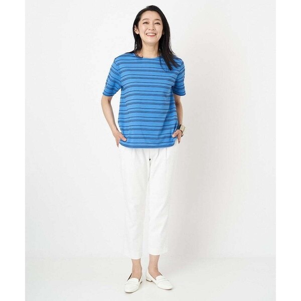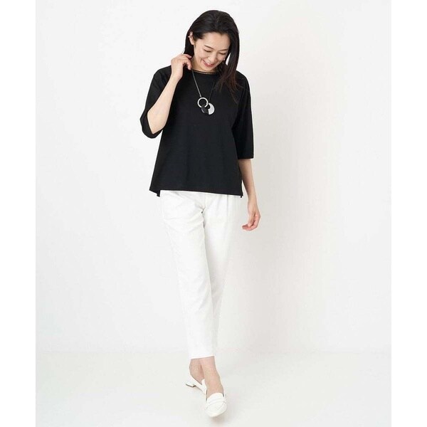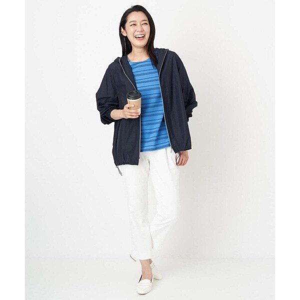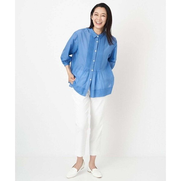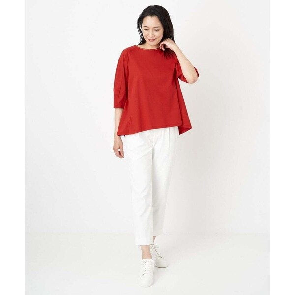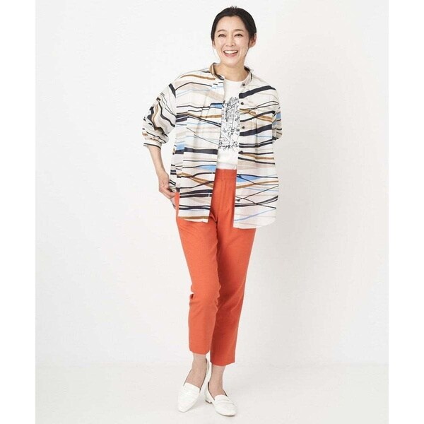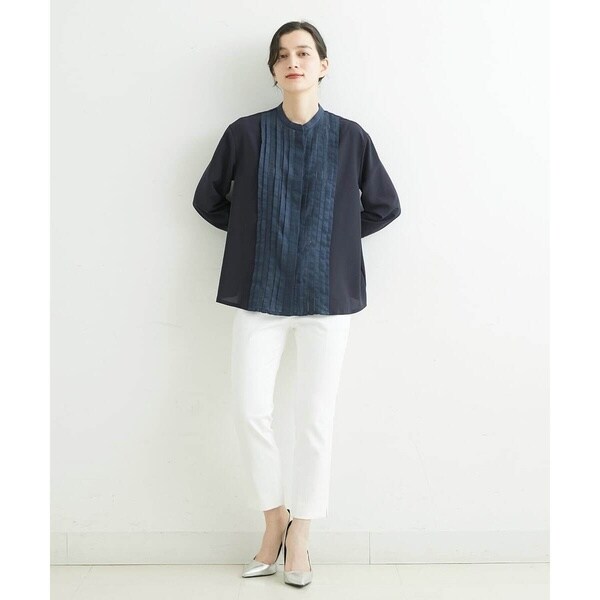 1タックでヒップから太ももはほど良いゆとりがあり、膝下はすっきりとしたストレートシルエットでとても綺麗な脚のラインに。後ろウエストはゴムギャザーでストレスフリーな穿き心地。ドライタッチな素材でストレッチが効いているので楽ちんな穿き心地です。さらにシワになりにくい素材なので長時間の座り仕事にもうってつけのパンツです。 部分で配色の閂止めとステッチを使い、デニムのディテールを入れた後ろのアウトポケットデザインでカジュアルスタイルにもすんなりと馴染み、デイリーユースしやすいアイテム。