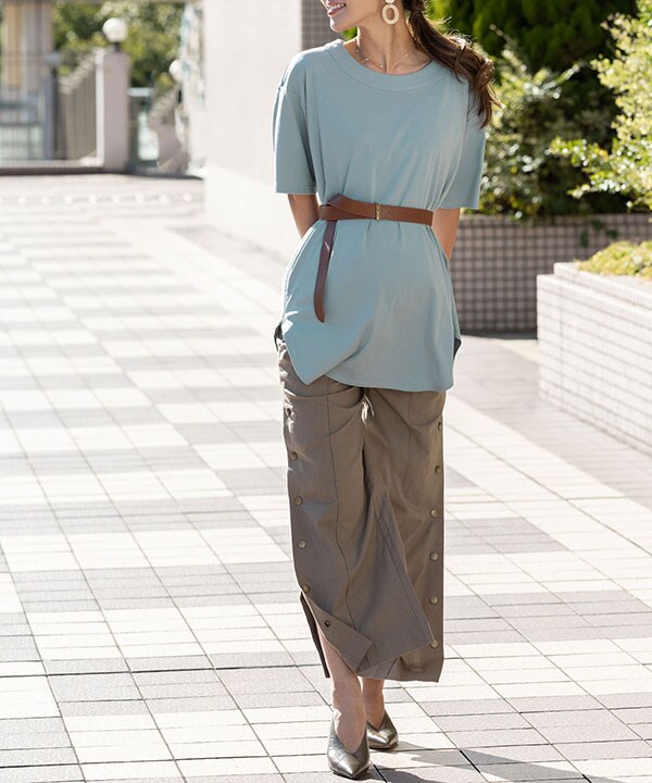 程よく体型カバーできて妊婦さんも産後ママも卒乳後も、誰が着てもサマになるTシャツです。