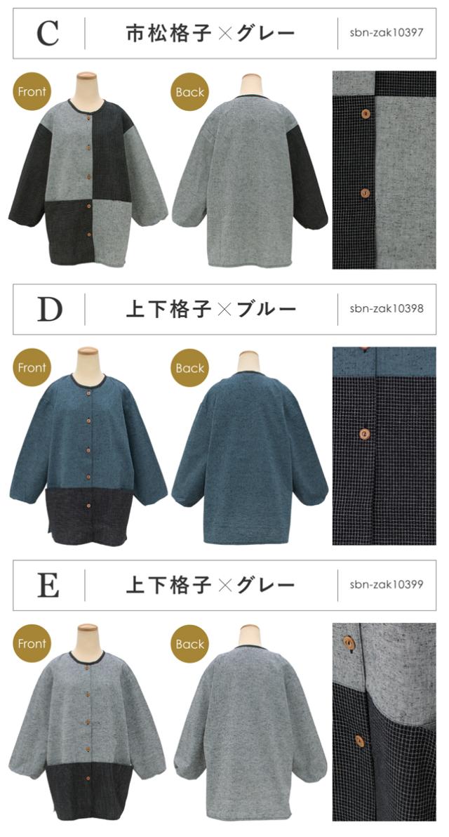 上着のように前釦で、ストライプには左にポケットがあり、市松と上下切替タイプには切替部分にポケットがあります。
