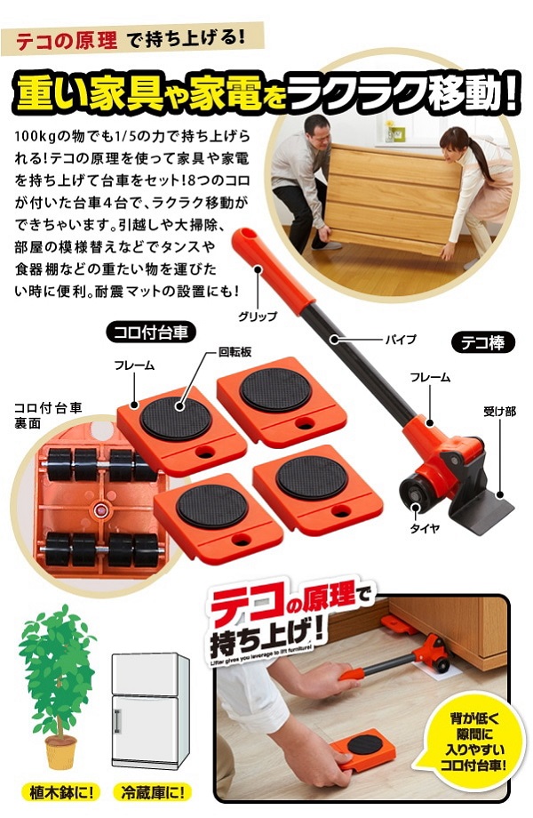 家具・家電の移動キャリー コジット キャリー 移動 家具 家電 4個 移動 可動 キャスター 台車 コロ 4個 模様替え 大掃除 掃除 引越しテコ棒 テコ 植木鉢 冷蔵庫 タンス 食器棚 新生活