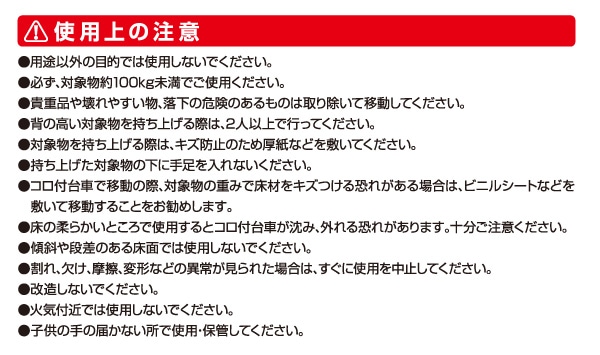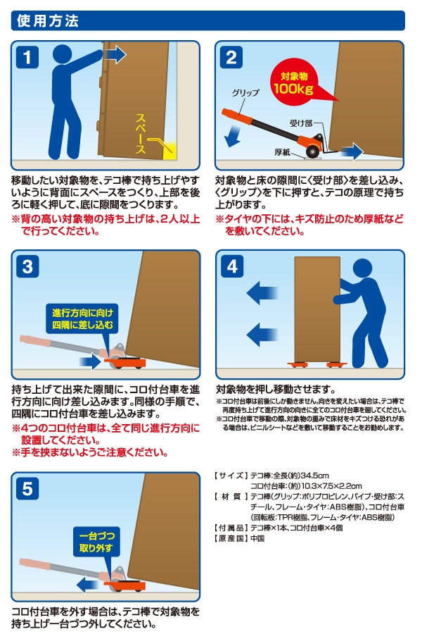 | 材質 | テコ棒(グリップ : ポリプロピレン、パイプ・受け部 : スチール、フレーム・タイヤ : ABS樹脂) コロ付台車(回転板 : TPR樹脂、フレーム・タイヤ : ABS樹脂) |