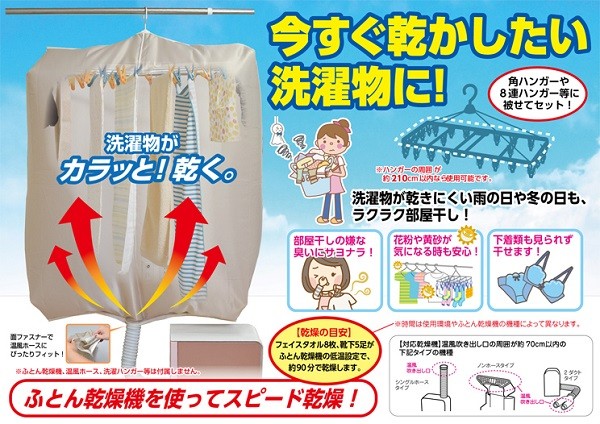 今すぐ乾かしたい洗濯物に! 洗濯物が乾きにくい雨の日や冬の日も、ふとん乾燥機を使ってスピード乾燥! 部屋干しなので、下着類も見られずに乾燥できます。 花粉や黄砂が気になる時も室内乾燥なので安心! 袋自体も洗濯機で丸洗いできます。 |