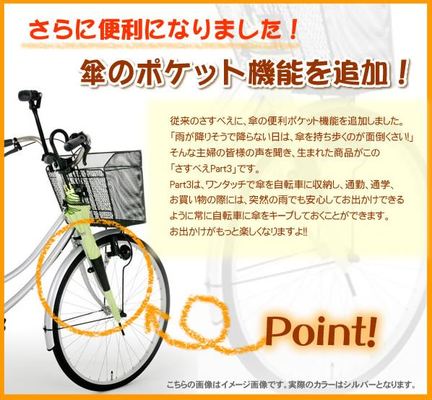 | 従来のさすべえに、傘の便利ポケット機能を追加しました!ワンタッチで傘を自転車に収納し、突然の雨でも安心してお出かけできるように常に自転車に傘をキープしておくことができます。 |
