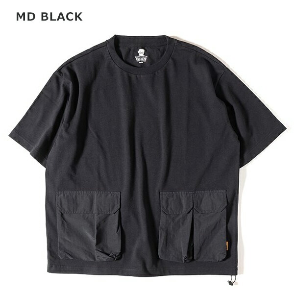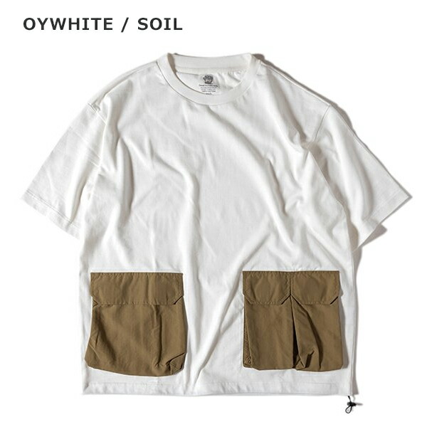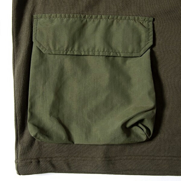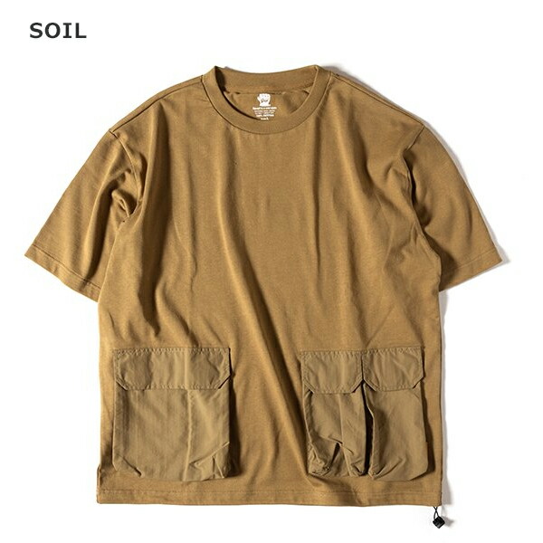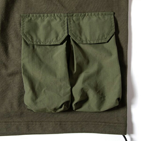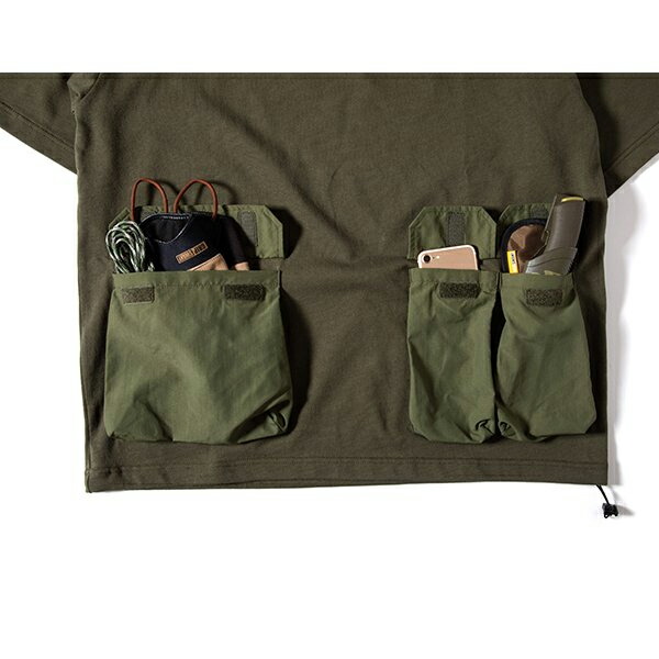 厚手のコットン生地を使ったタフなTシャツ、 GRIPSWANYらしいミリタリーテイストでユニークなナイロンポケットがアクセント。 裾にはドローコードが施されており着丈をアレンジ出来ます。 キャンプで物を落とさない工夫のデザインになっています。 | ||||||