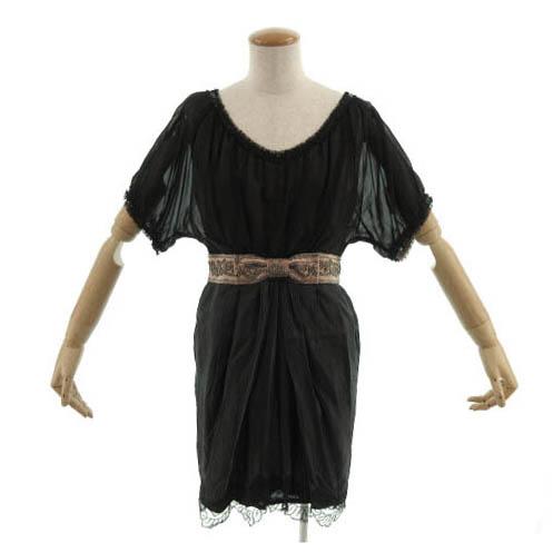 【中古】グレースコンチネンタル ワンピース ビーズ 半袖 切替 ひざ丈 ギャザー シルク 黒 ピンクベージュ 36