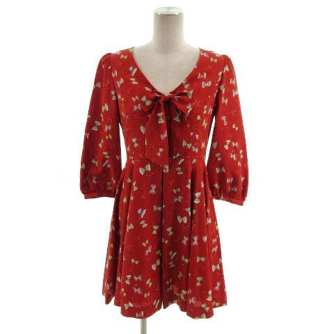 【中古】シンシアローリー ワンピース リボン 七分袖 ミディ丈 ビジューボタン リボン柄プリント 赤系 マルチカラー 2