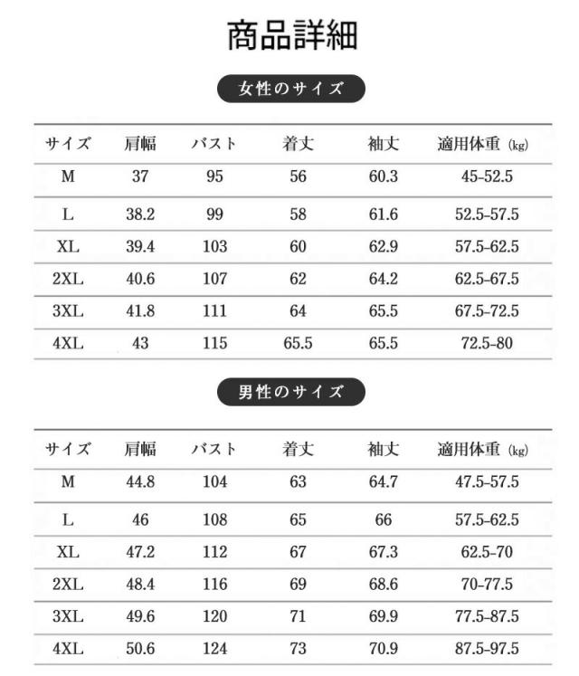 | 男性のサイズ: | M 着丈:63cm バスト:104cm 肩幅:44.8cm 袖丈:64.7cm 適用体重:47.5-57.5kg L 着丈:65cm バスト:108cm 肩幅:46cm 袖丈:66cm 適用体重:57.5-62.5kg XL 着丈:67cm バスト:112cm 肩幅:47.2cm 袖丈:67.3cm 適用体重:62.5-70kg 2XL 着丈:69cm バスト:116cm 肩幅:48.4cm 袖丈:68.6cm 適用体重:70-77.5kg 3XL 着丈:71cm バスト:120cm 肩幅:49.6cm 袖丈:69.9cm 適用体重:77.5-87.5kg 4XL 着丈:73cm バスト:124cm 肩幅:50.6cm 袖丈:70.9cm 適用体重:87.5-97.5kg |