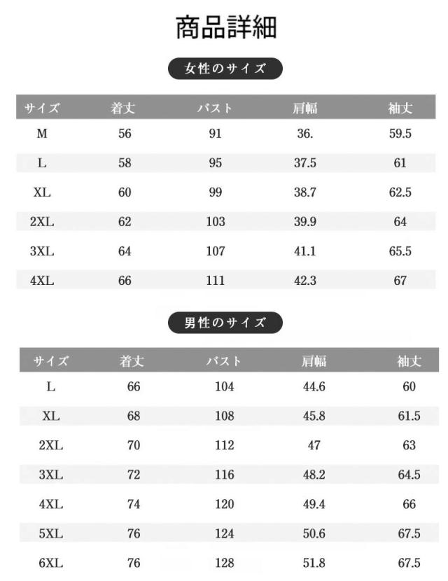 | 男性のサイズ: | L 着丈:66cm バスト:104cm 肩幅:44.6cm 袖丈:60cm XL 着丈:68cm バスト:108cm 肩幅:45.8cm 袖丈:61.5cm 2XL 着丈:70cm バスト:112cm 肩幅:47cm 袖丈:63cm 3XL 着丈:72cm バスト:116cm 肩幅:48.2cm 袖丈:64.5cm 4XL 着丈:74cm バスト:120cm 肩幅:49.4cm 袖丈:66cm 5XL 着丈:76cm バスト:124cm 肩幅:50.6cm 袖丈:67.5cm 6XL 着丈:76cm バスト:128cm 肩幅:51.8cm 袖丈:67.5cm |