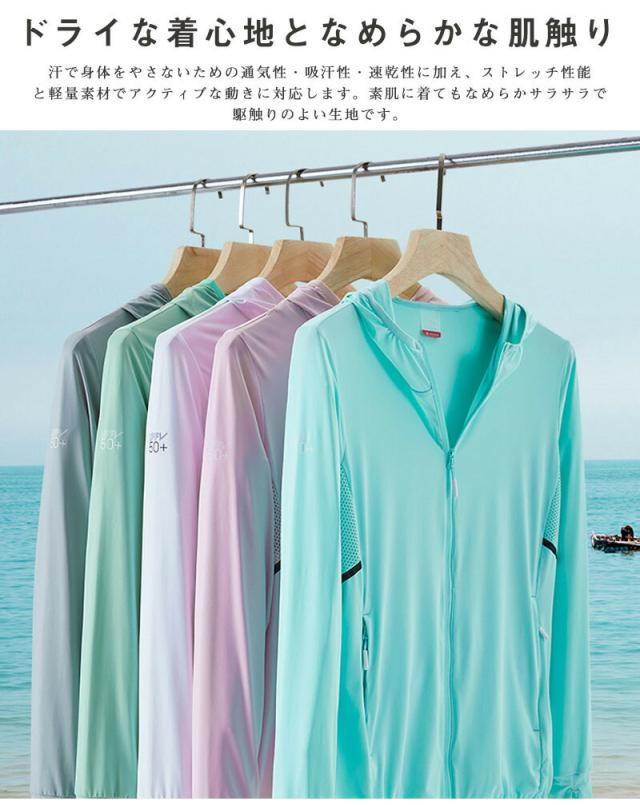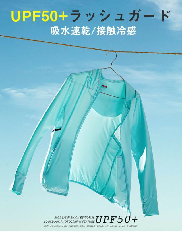 送料無料-ラッシュガード レディース UVパーカー 長袖 ラッシュガードシャツ おしゃれ ホワイト UVカット UPF50+ 夏用 冷感 UV対策 吸汗 速乾 シンプル 伸縮性 紫外線カット パーカー 軽量 日焼け 通気 -0710