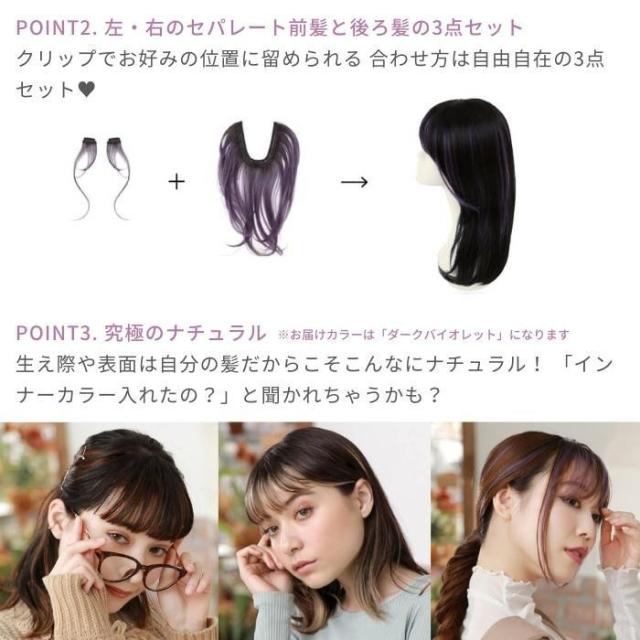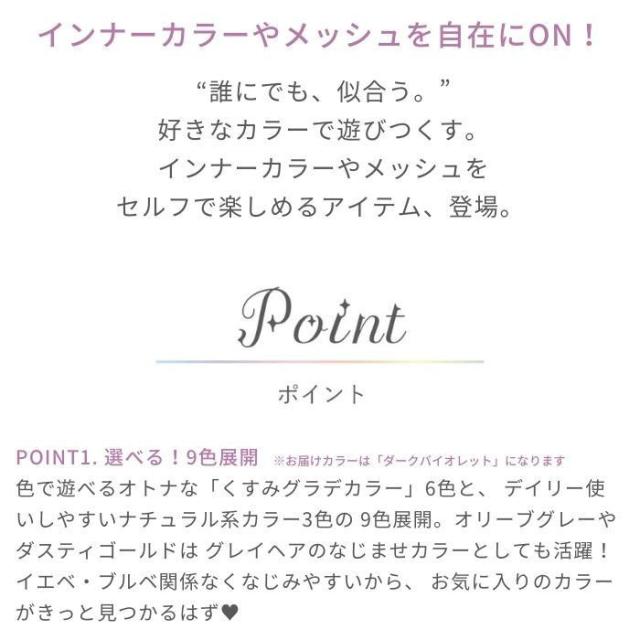 商品詳細:「誰にでも、似合う。」好きなカラーで遊びつくす。インナーカラーやメッシュをセルフで楽しめるアイテムです。 生産国:中国 素材・材質:耐熱ファイバー100% 仕様:■ウィッグのタイプクリップで固定するタイプのインナーエクステンション後ろ髪エクステ用×1個・前髪用×2個のセット■サイズ【エクステ】パーツ×1個入り髪の長さ(約)/サイド:19cm、後ろ:33cm土台(約)/幅:29cm、高さ:2.3cmクリップ3個付き【前髪】パーツ×2個入り髪の長さ(約)/内側:14cm、外側:32cm土台(約)/上部:3cm、下部:4.5cmクリップ1個付き※ウィッグパーツは合計3個入り