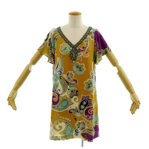【中古】グレースコンチネンタル ワンピース ビジュー ビーズ ひざ丈 シルク ペイズリー柄 マルチカラー 36