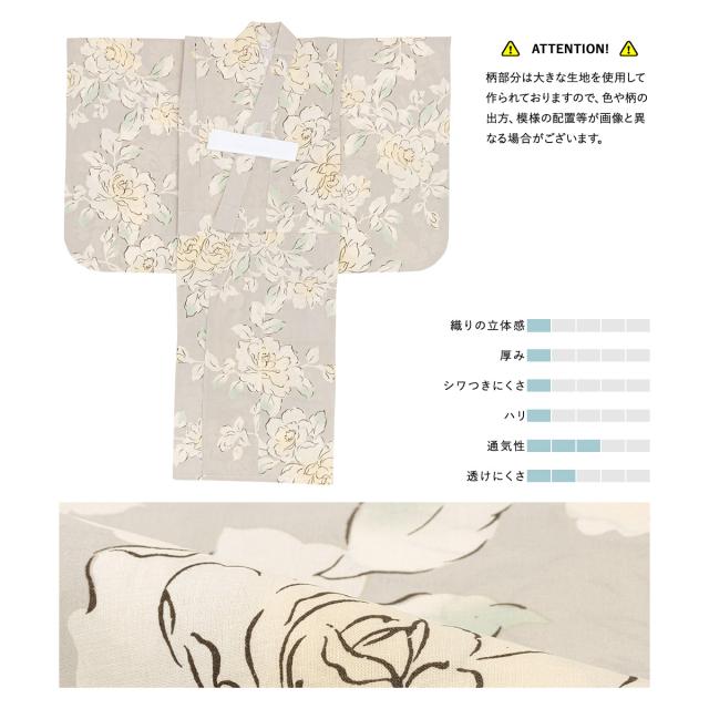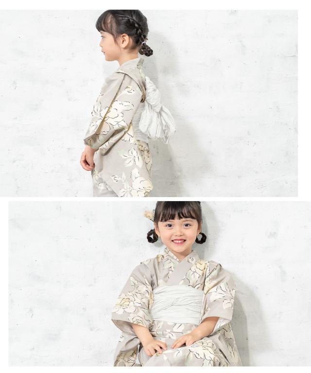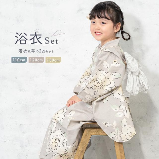 浴衣 子供 女の子 セット 2点セット キッズ 女児 グレージュ 牡丹 花 フラワー 白茶 綿 夏 110cm 120cm 130cm 送料無料