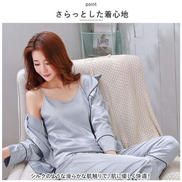 | 商品説明 | ・着心地軽やか!シルクのような肌触りのルームウェアが登場! 【さらっとした着心地】 ・シルクのような滑らかな肌触りで、肌に優しく快適! 【うれしい3点セット】 ・長袖のトップス、ロングパンツに合わせて、インナーにキャミソールがついているのもうれしい。 【ベーシックな長袖トップス】 ・スムーズに脱ぎ着できるフロントボタンタイプ。襟元が程よく開いて寝苦しさを軽減◎左胸元にポケット付き。 【ウェストゴム】 ・ロングパンツは締め付け感のないウェストゴム仕様。おうちでのリラックスタイムにピッタリ。 【旅行のおともに】 ・光沢のあるシンプルでエレガントな印象のルームウェア。軽くてコンパクトに畳んで旅行などに持っていくのも◎ |