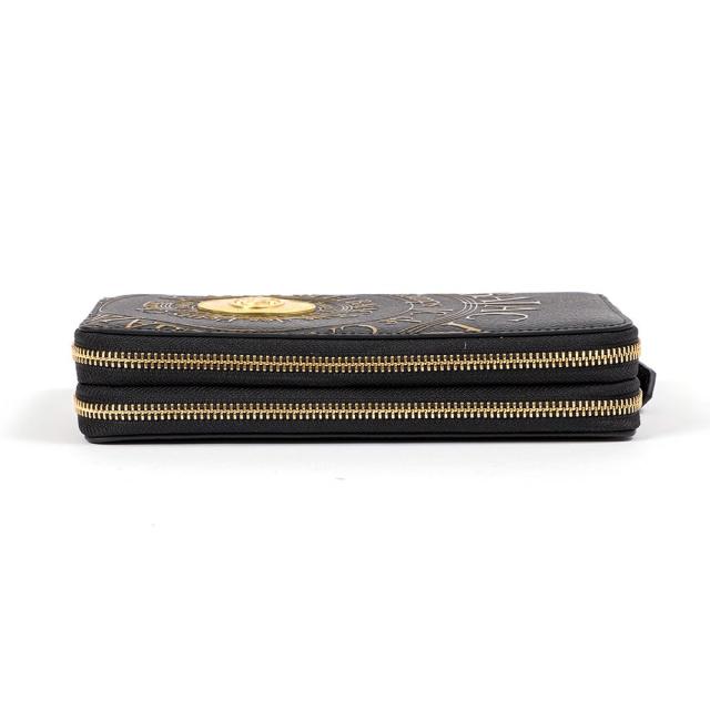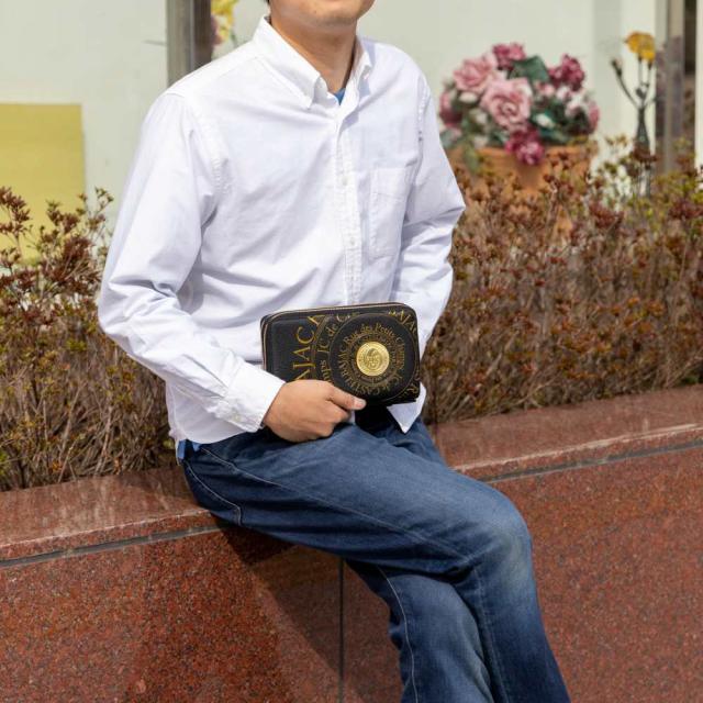 オールレザーの上質なメンズバッグシリーズ。フランスのコインをモチーフにした立体的なゴールドプレートと、その周りに施されたゴールドプリントがハイグレードな男らしさを演出するデザインです。
