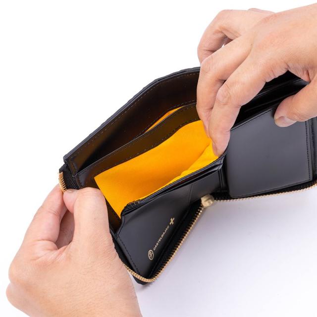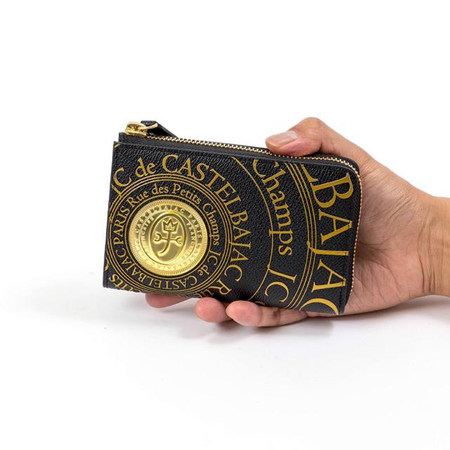 CASTELBAJACの発祥国であるフランスのコインをモチーフにした、立体的なゴールドプレートをあしらった二つ折り財布です。プレートの周りにはゴールドプリントが施され、ハイグレードな男らしさを演出しました。