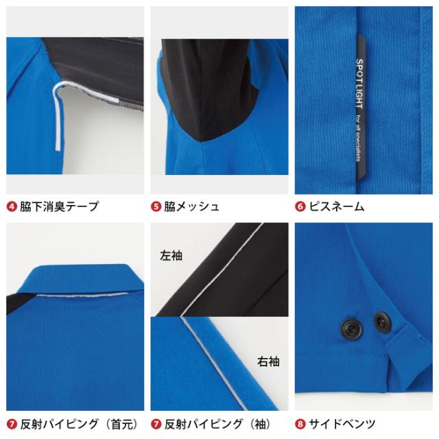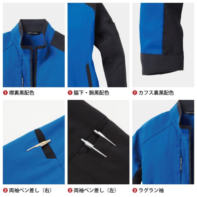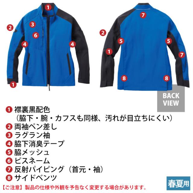◇機能:ラグラン袖・ピスネーム・両袖ペン差し(右)・衿裏黒配色・反射パイピング・両袖ペン差し(左)・脇下消臭テープ・サイドベンツ・反射パイピング(首元)