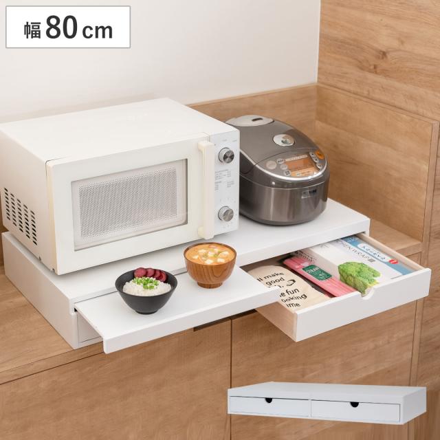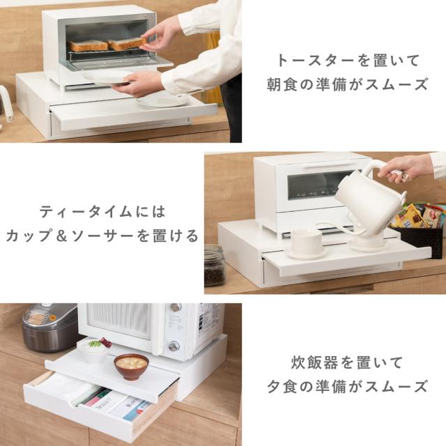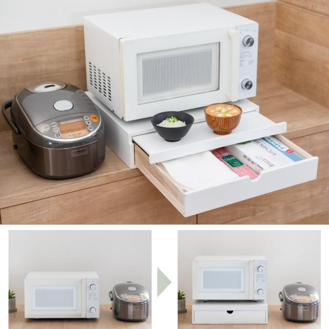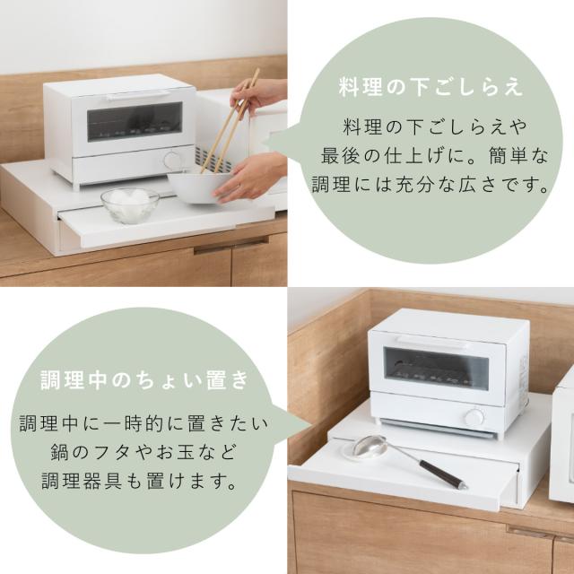 家電の下に置くだけで作業スペースが作れる引き出し付きの家電下スライドテーブルです。トレーに調理器具や料理をサッと置いて家事の作業効率がアップします。使わない時は邪魔にならず、必要な時だけ引き出せる便利なスライドトレーなので、手狭なキッチンのお家やワンルームの一人暮らしの方におすすめです。