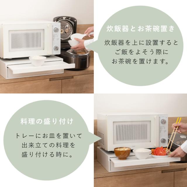 食器や調理器具などをちょっと置きたい時にも便利です。ご飯をよそう時にお茶碗を並べたり、一時的に置きたい鍋のフタやお玉などの調理器具を置いたりと様々な使い方ができます。