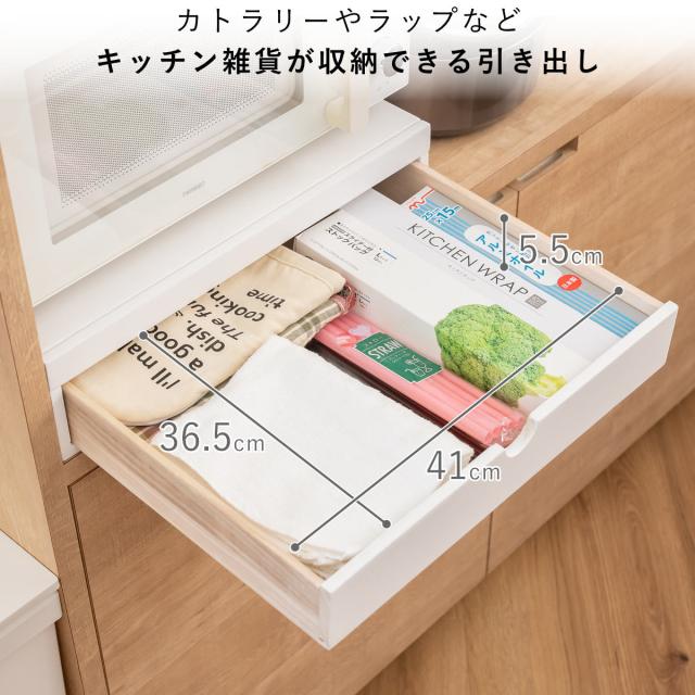 引き出しには、キッチンに置きたいカトラリーやラップ、ミトンなどをまとめて収納できるのでキッチン周りがすっきり片付きます。