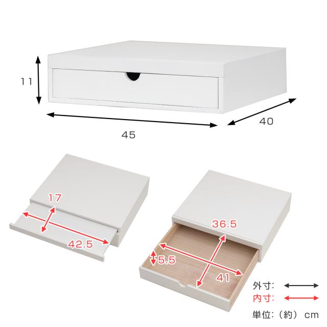 | サイズ | 約 幅45×奥行40×高さ11(cm) 引出し内寸:約 幅41×奥行36.5×高さ5.5(cm) トレー有効:約 幅42.5×奥行17(cm) |