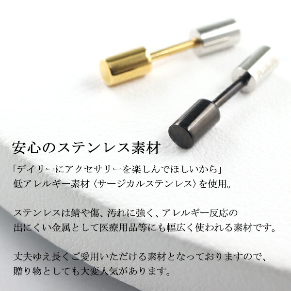 アレルギー性が低い金属のため、金属アレルギーによってシルバーアクセ等を使用できない方にオススメの素材です。 また変色の起こらない金属のため、磨くといったお手入れが不要でとても気軽にお楽しみ頂けます。