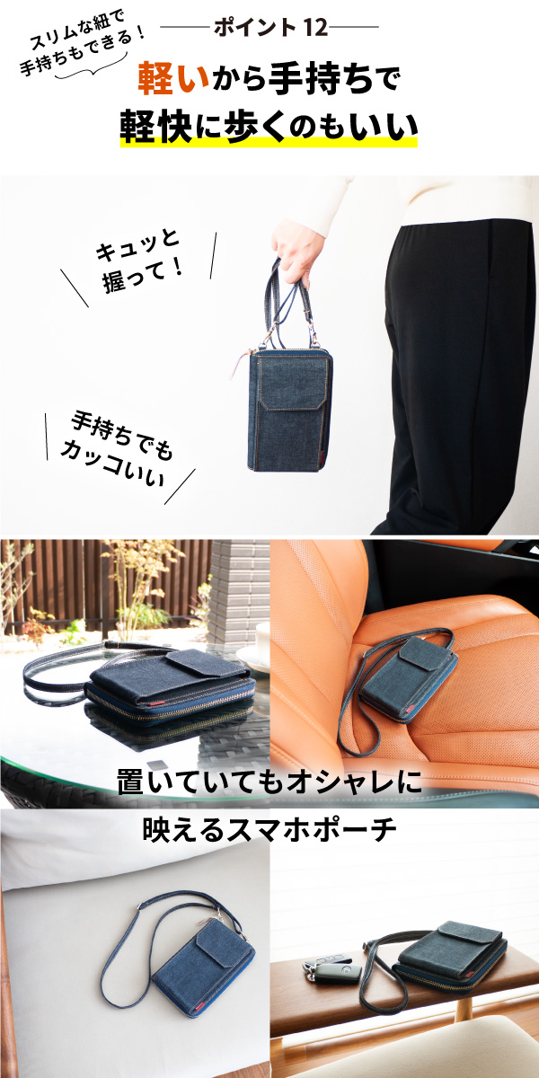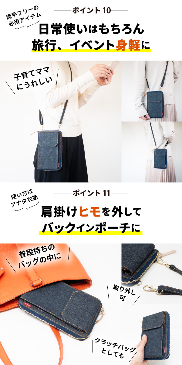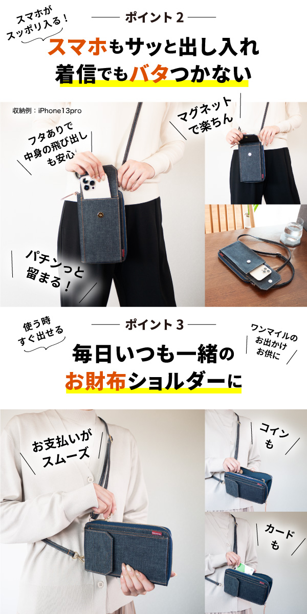 ■ポイント1、財布にスマホを入れて肩から下げる。