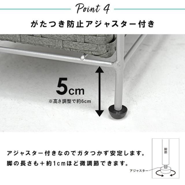 ■アジャスター付■カゴ部内寸:約幅17×奥行37×高さ13cm■引出し内寸(浅):約幅15×奥行37×高さ13cm■引出し内寸(深):約幅15×奥行37×高さ26cm通気性の良い、引出しで水回りの収納もバッチリ!