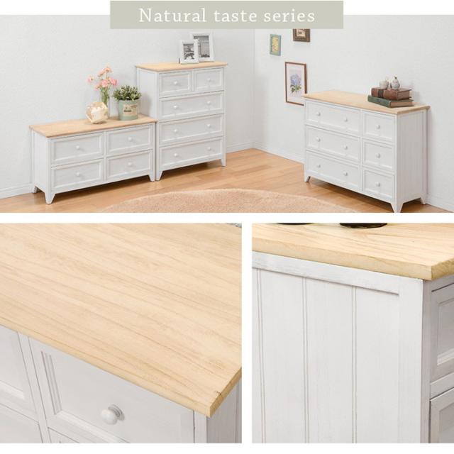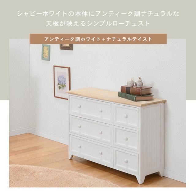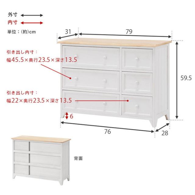 ■引出内寸(小):約幅22×奥行23.5×深さ13.5cm■引出内寸(大):約幅45.5×奥行23.5×深さ13.5cmシャビーホワイトの本体にアンティーク調ナチュラルな天板が映える、シンプルローチェスト。