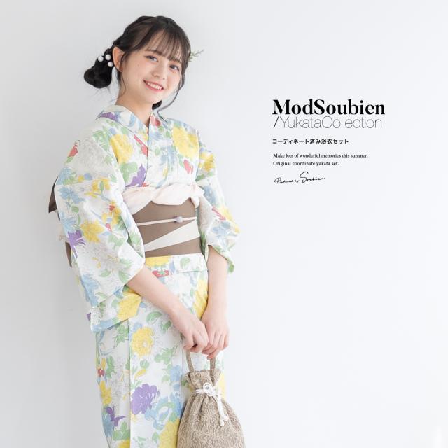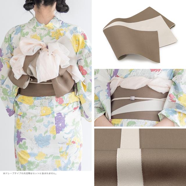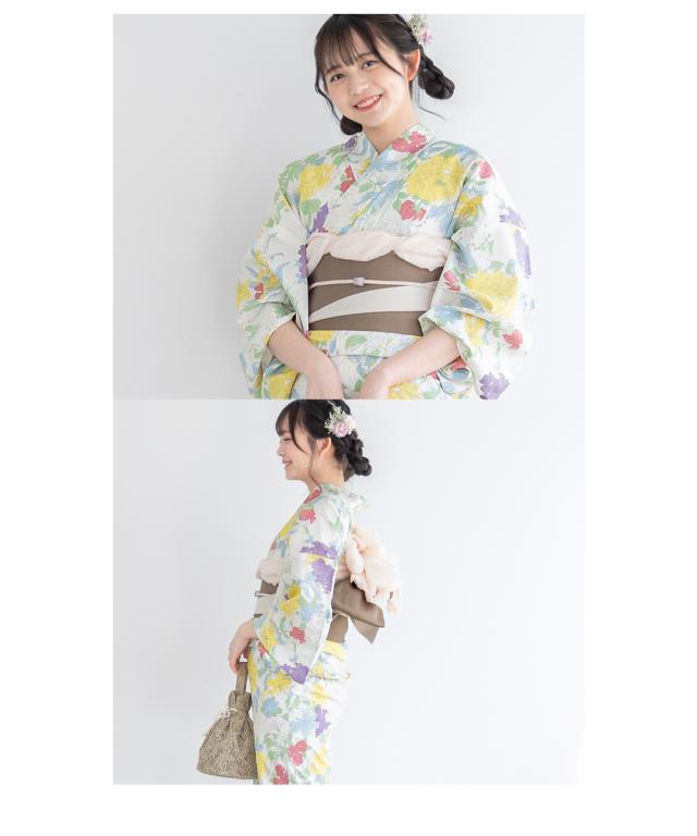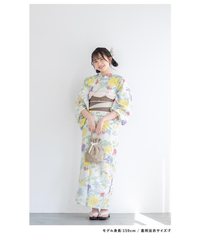 浴衣 セット レディース 浴衣セット 半幅帯 2023 大人 3点セット ホワイト 白 黄色 イエロー カラフル 牡丹 百合 花 グレージュ S フリー 送料無料