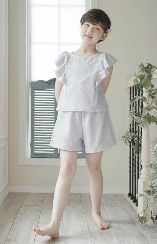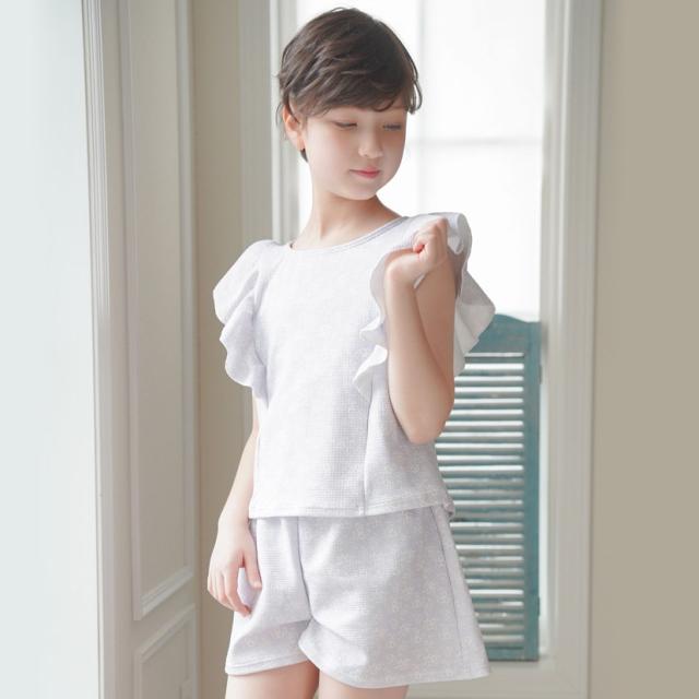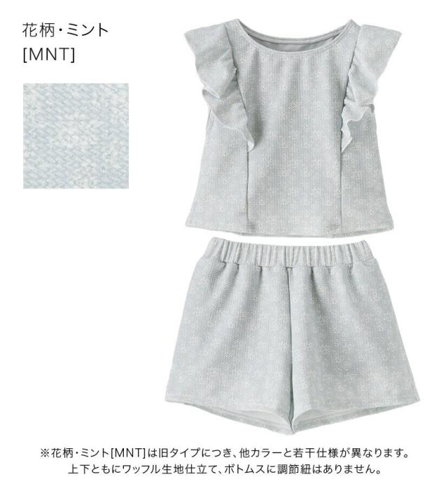 上下ともにワッフル生地仕立て、ボトムスに調節紐はありません。