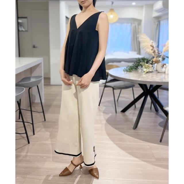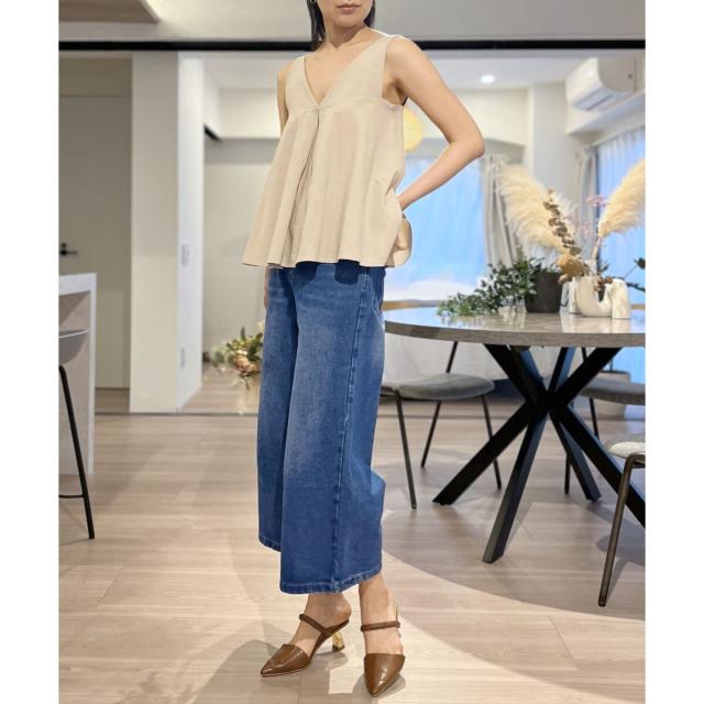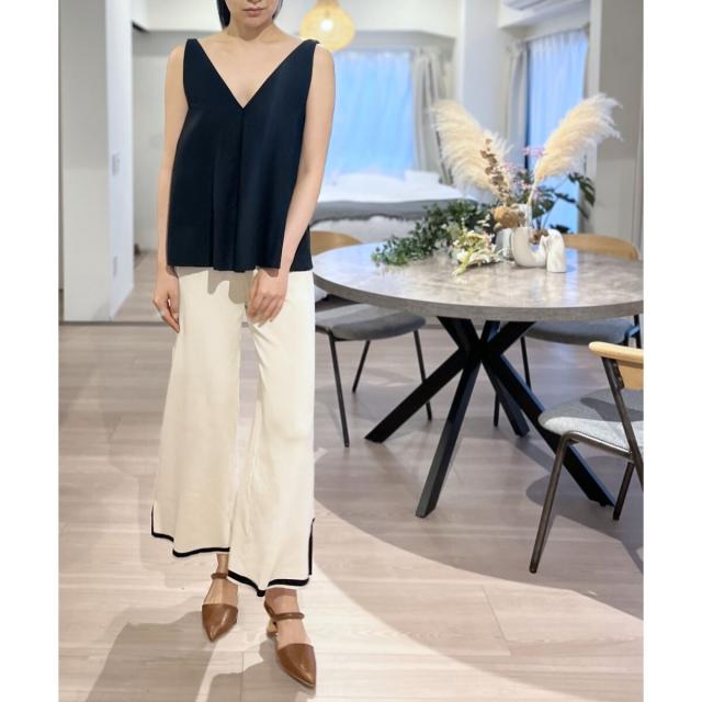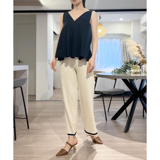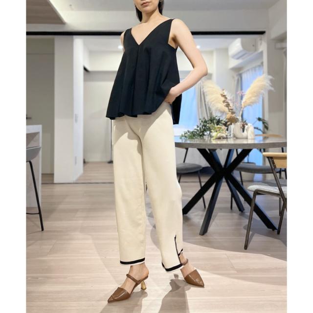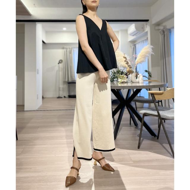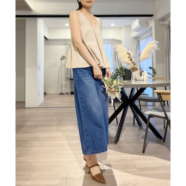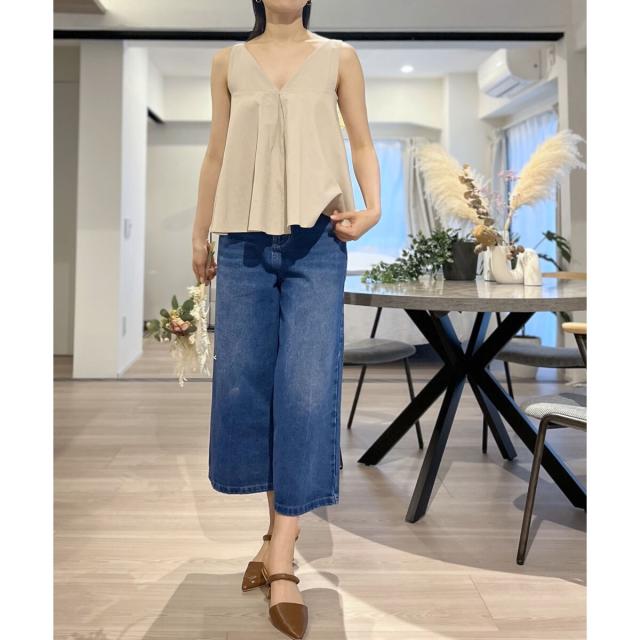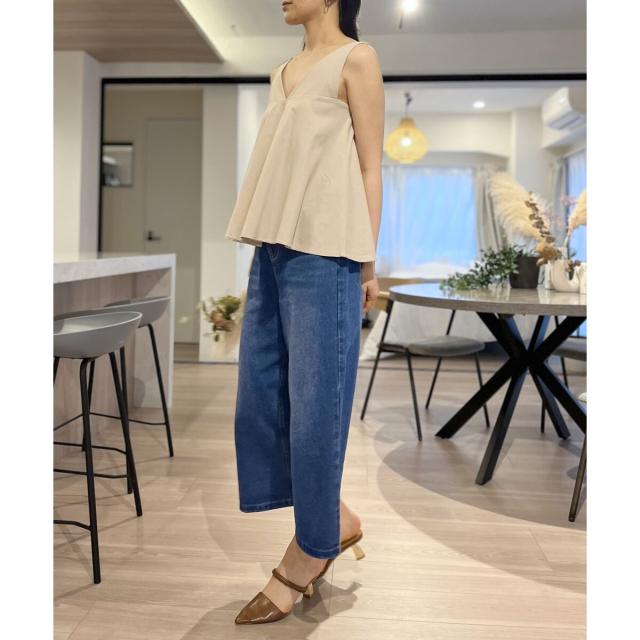 首回りが広めに開いているので、ボリューム感のあるボトムスでも