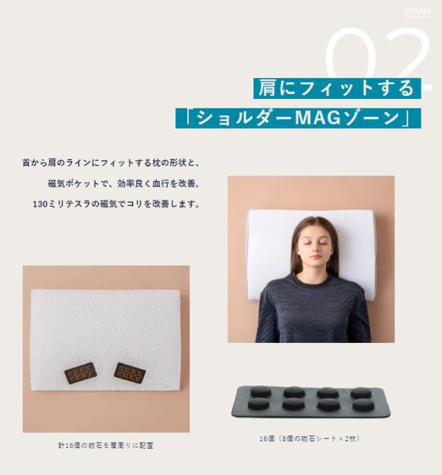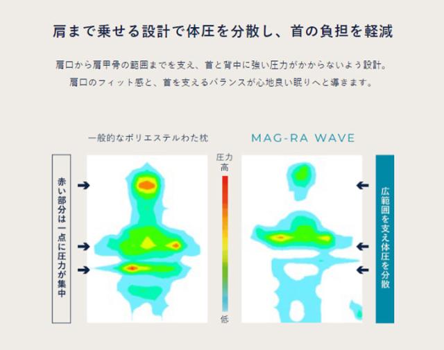 | 備考 | MAG-RA WAVE 枕本体、MAG-RA WAVE 専用 枕カバー、MAG-RA WAVE 専用 高さ調整シート、磁石シート×2枚※本体付属の「MAG-RA WAVE 専用 枕カバー」をご使用の場合、収納できる「高さ調整シート」は、同じく本体付属の1セットに加えて1セットまでとなります。別売り「高さ調整シート」をご購入の際はご留意いただきますようお願いいたします。 |