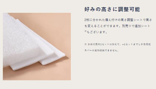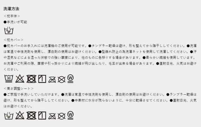 | 材質 | <枕本体>ポリエチレン100%<枕カバー>[表生地]ポリエステル60%、再生繊維(リヨセル)40%[内生地]ポリエステル:100% [マチ、裏生地]ポリエステル:100%<高さ調整シート>[芯材]ポリエチレン100% [カバー]ポリエステル:100% |