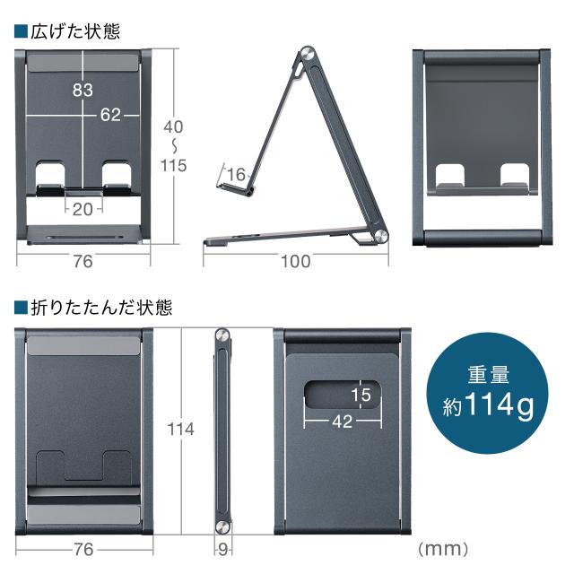 ■製品サイズ:約W76×D100×H40〜115mm(スタンド時)、約W76×D9×H114mm(折りたたみ時)■製品重量:約114g