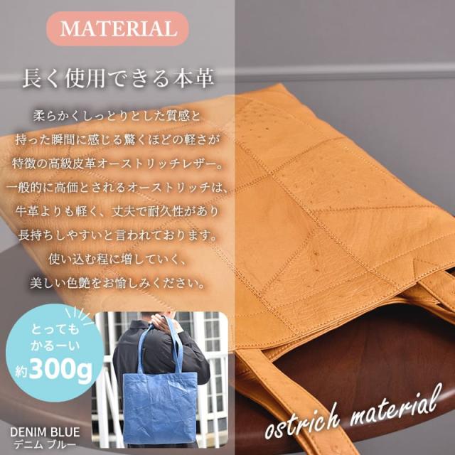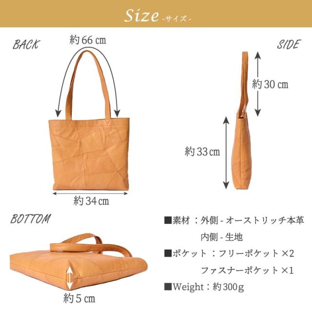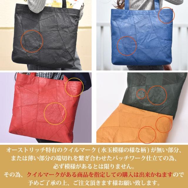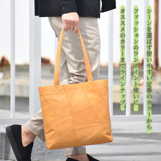 『当店人気の本革トートバッグがリニューアル!』 オンオフで使えるシンプルデザインのレザートートバッグが高級皮革 オーストリッチのパッチワークになってリニューアルしました。 シーズン問わず使えて普段使いはもちろん、ビジネスにも最適です。 『男女兼用で使いやすい定番のカラーから、女性に人気のカラーまでラインナップ。』 『長く使用できる本革』 柔らかくしっとりとした質感と持った瞬間に感じる 驚くほどの軽さが特徴の高級皮革オーストリッチレザー。 一般的に高価とされるオーストリッチは、牛革よりも軽く、 丈夫で耐久性があり長持ちしやすいと言われております。 使い込む程に増していく、美しい色艶をお愉しみください。 『廃棄される余り革を繋ぎ合わせたパッチワーク調のエコトートバッグ』 これまで革製品を製造の際に生まれる使用されない端切れ(余り革)は、 廃棄されるなどの事もあり、『端切れの革から何か製品にできれば。』との 現場の勿体ないの声からパッチワーク調トートバッグが誕生しました。 長めのハンドル設計で肩掛けもラクラク。 ハンドルは長めの仕様で上着を着ていても腕を通しやすく、肩にフィットしやすい、平たいハンドルを採用。 オーストリッチ特有のクイルマーク(水玉模様の様な柄)が無い部分、 または薄い部分の端切れを繋ぎ合わせたパッチワーク仕立ての為、必ず模様があるとは限りません。 その為、クイルマークがある商品を指定しての購入は出来かねますので 予めご了承の上、ご注文頂きます様お願い致します。 雑誌やポーチ、洋服などスッポリ収まる収納力。 A4ファイルはもちろん、書類まで収まるので多様な場面であると便利なバッグです。 通常であれば破棄される革の端切れを使用したパッチワーク製品となっておりますので、 革の繋ぎ目が目立つ物と革のパーツ毎に質感が変わる物もございます。 また、生きていた証である天然のキズやシワが入っている場合もありますが、 これらは個体差と言われる二つとない表情を魅せる本革の個性となっております。 お手にお取りの際は、人の手により繋ぎ合わされた革の風合いとしてお愉しみ頂けましたら幸いでございます。 |