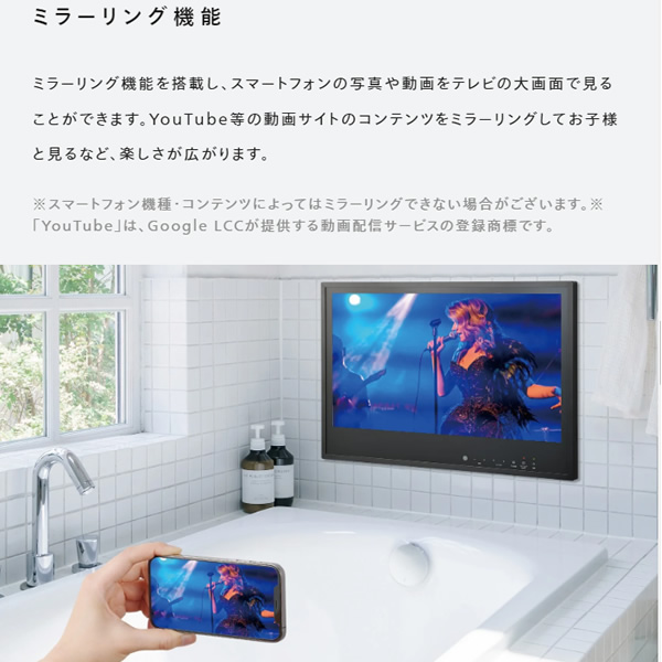 ツインバードの「24V型浴室テレビ」は、スマートフォンの画面をテレビでも見られるミラーリング機能を搭載した日本製の浴室テレビです。地デジ・衛星放送(BS・110度CS)の受信に対応。モニターはJIS IPX5相当、リモコンはJIS IPX7相当の防水設計。操作ボタンは操作性を重視した大きめ設計。約207万画素の解像度の高精細フルハイビジョン液晶パネルを採用した、おうちのお風呂時間をお楽しみ頂ける浴室テレビです。