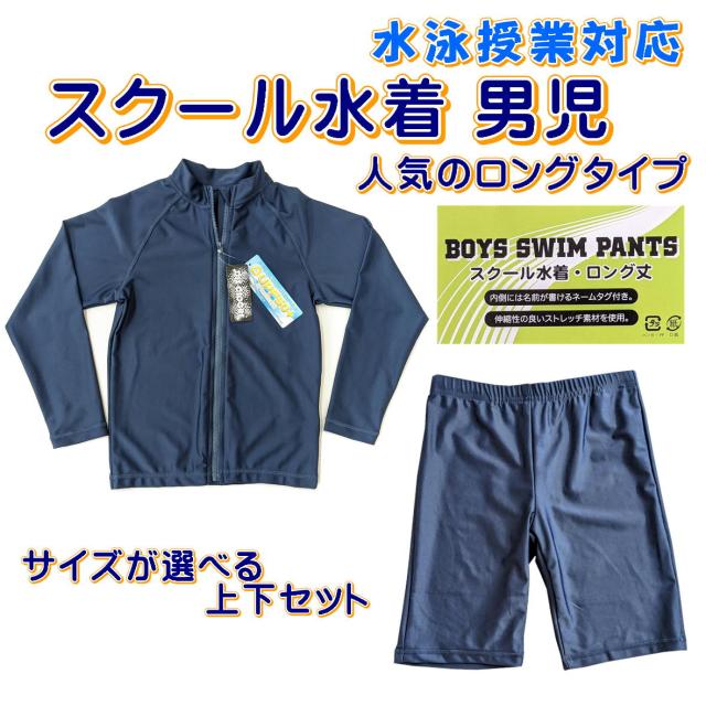 【男児水着上下セット サイズが選べる】 スクール水着 スイムパンツ ラッシュガード パンツと水着のセット 水着 子供 キッズ 男児 紺無地 ロング丈 120-170cm 入園 入学 通園 通学 水泳 UVカット 学校水着 スイミングスクール pool 前開き 男児水着