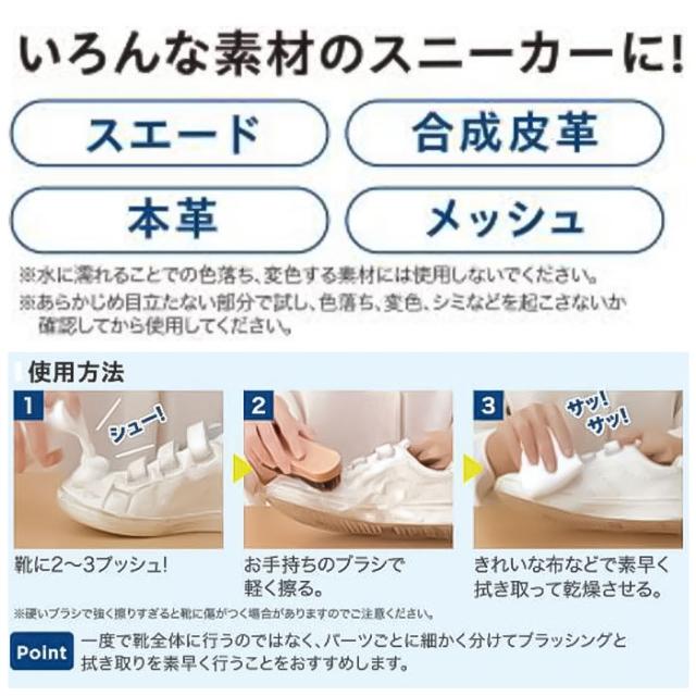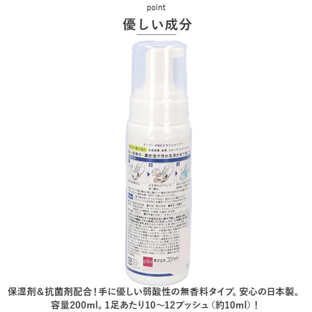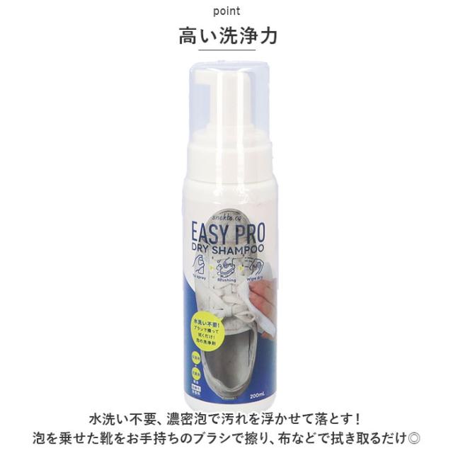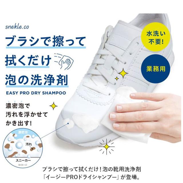 | 商品説明 | ・ブラシで擦って拭くだけ!泡の靴用洗浄剤「イージーPROドライシャンプー」が登場。 【高い洗浄力】 ・水洗い不要、濃密泡で汚れを浮かせて落とす!泡を乗せた靴をお手持ちのブラシで擦り、布などで拭き取るだけ◎ 【優しい成分】 ・保湿剤&抗菌剤配合!手に優しい弱酸性の無香料タイプ。安心の日本製。 【約20足分洗浄可能】 ・容量200ml。1足あたり10〜12プッシュ(約10ml)! 【万能アイテム】 ・これ1本で、合成皮革・本革・スエード・メッシュなど、色々な素材のスニーカーに対応。すぐに汚れてしまうお子さま用の靴もピカピカに! |
