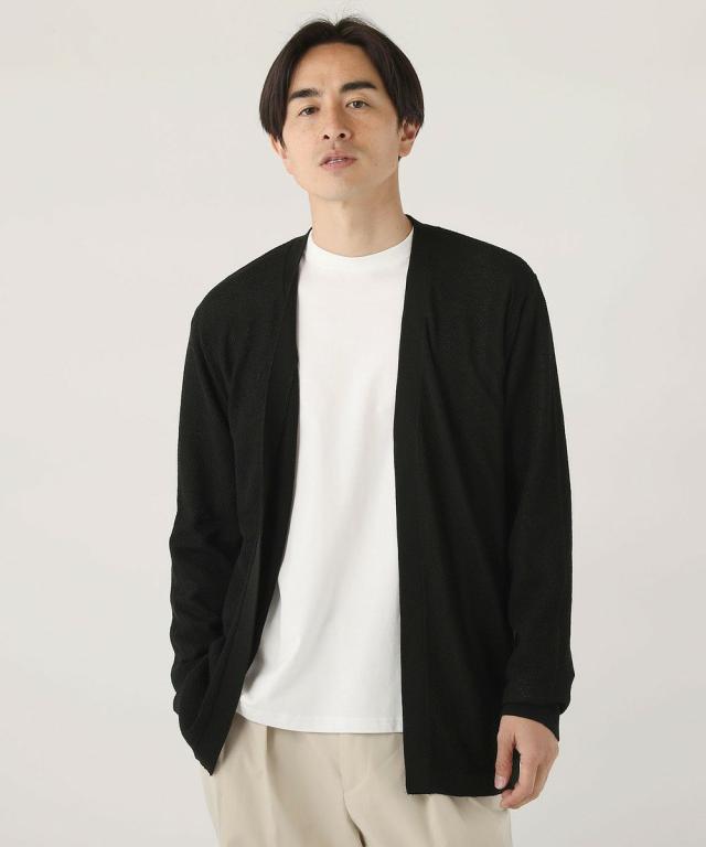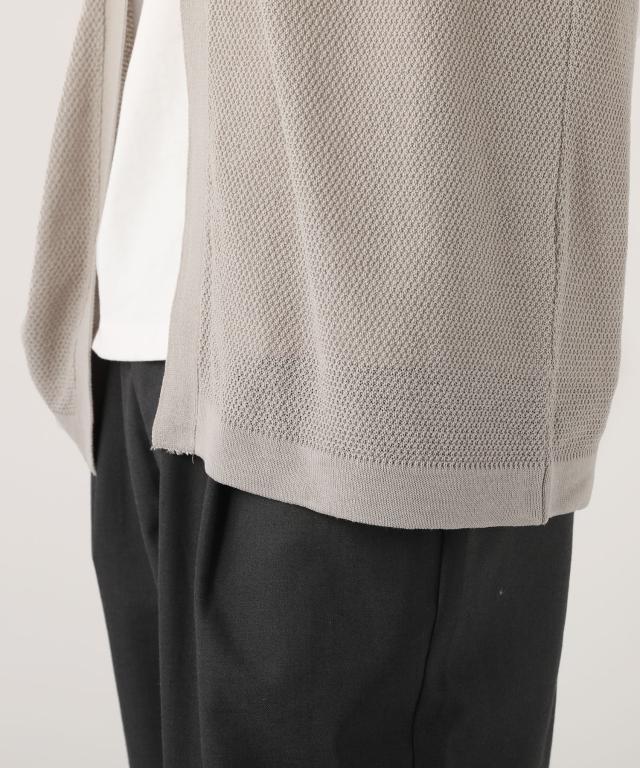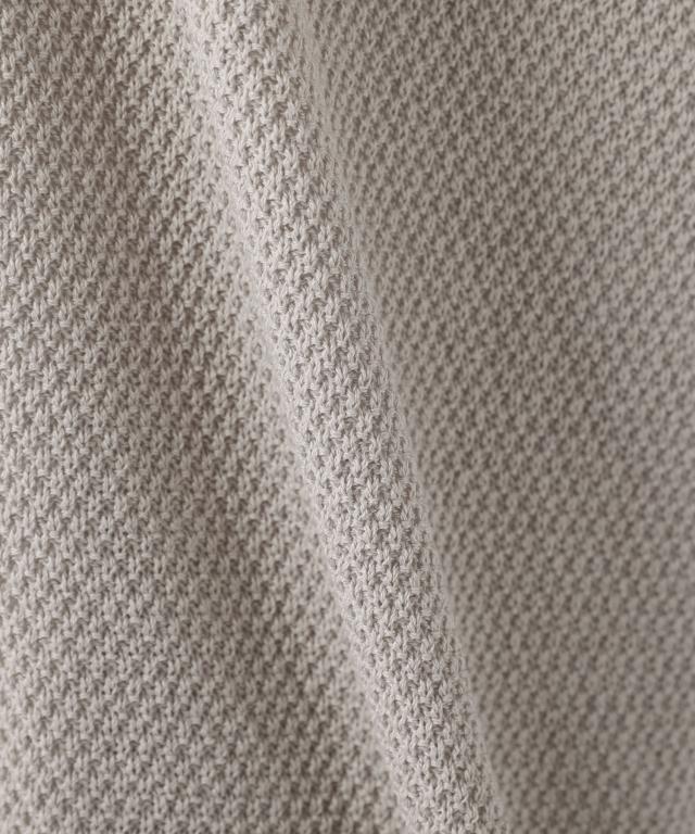 アクリル100%ですが、鹿の子編み独特の凹凸感のある生地面が、麻のようなナチュラルな風合いを作り出しています。ドライなタッチで涼し気な印象なので、夏の羽織りものにピッタリです。