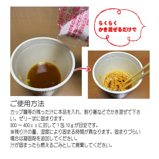 カップめん等の残った汁に本品の凝固剤を入れ、割り箸などでかき混ぜてください。ゼリー状に固まりますので、燃えるごみとして廃棄することができます。